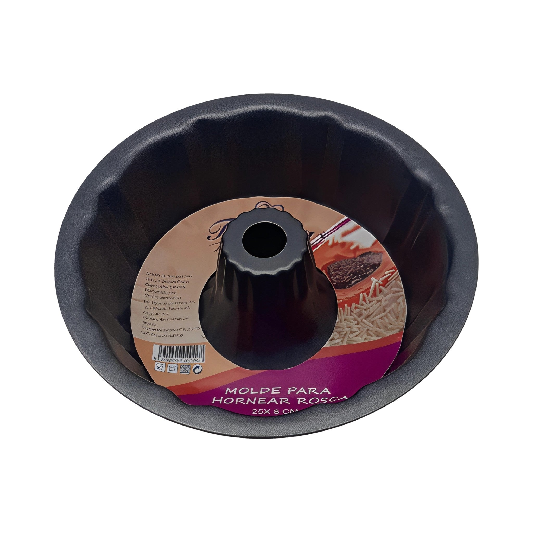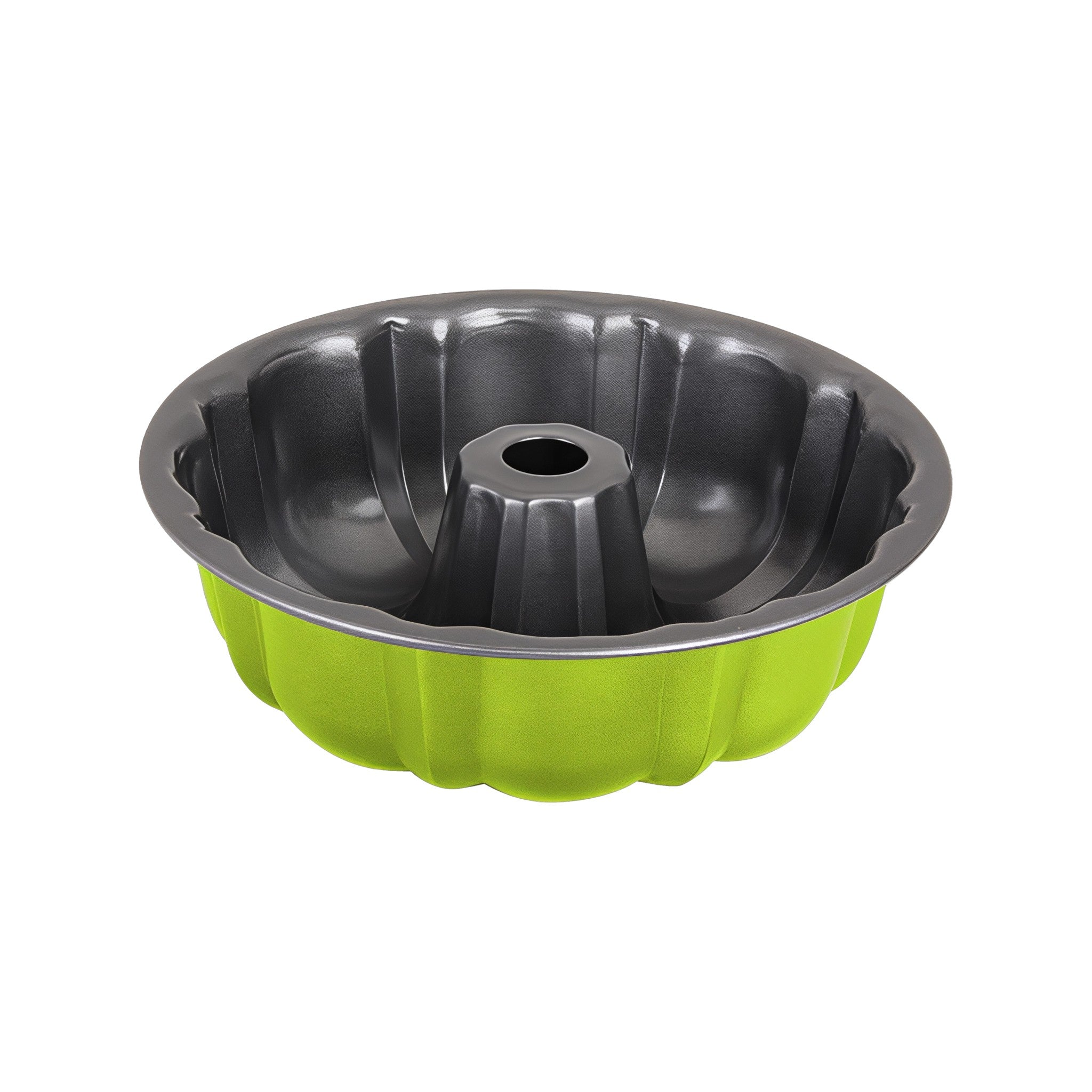 Molde para horno tipo rosca de 25 cm en elegante color verde, ideal para panqués, pasteles y gelatinas horneadas. Construcción resistente con recubrimiento antiadherente para un desmolde fácil y uniforme.