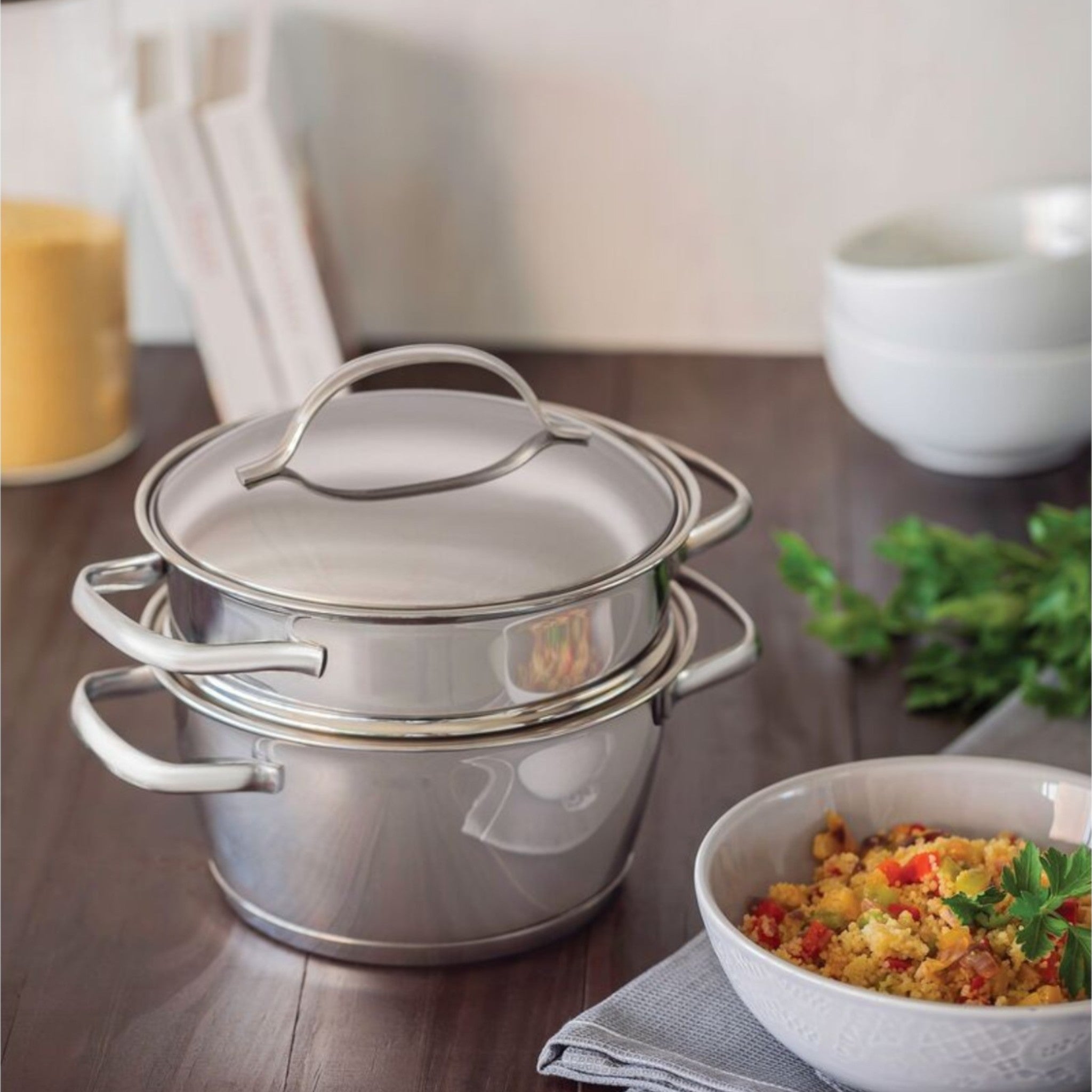 Cocina de forma saludable sin renunciar a la eficiencia con la vaporera Allegra de 2 piezas. Su diseño en acero inoxidable con fondo difusor garantiza una cocción uniforme y resultados profesionales en casa o en entornos exigentes.