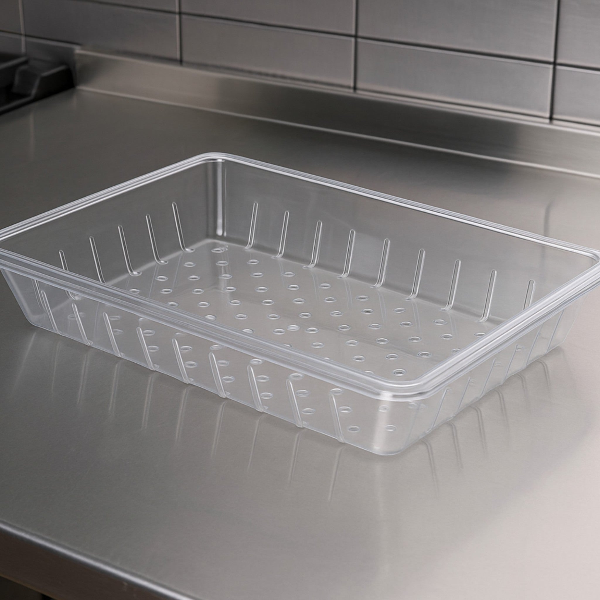 Diseño ventilado: Las paredes caladas permiten una óptima circulación de aire y drenaje de líquidos, ideal para productos frescos o recién lavados.