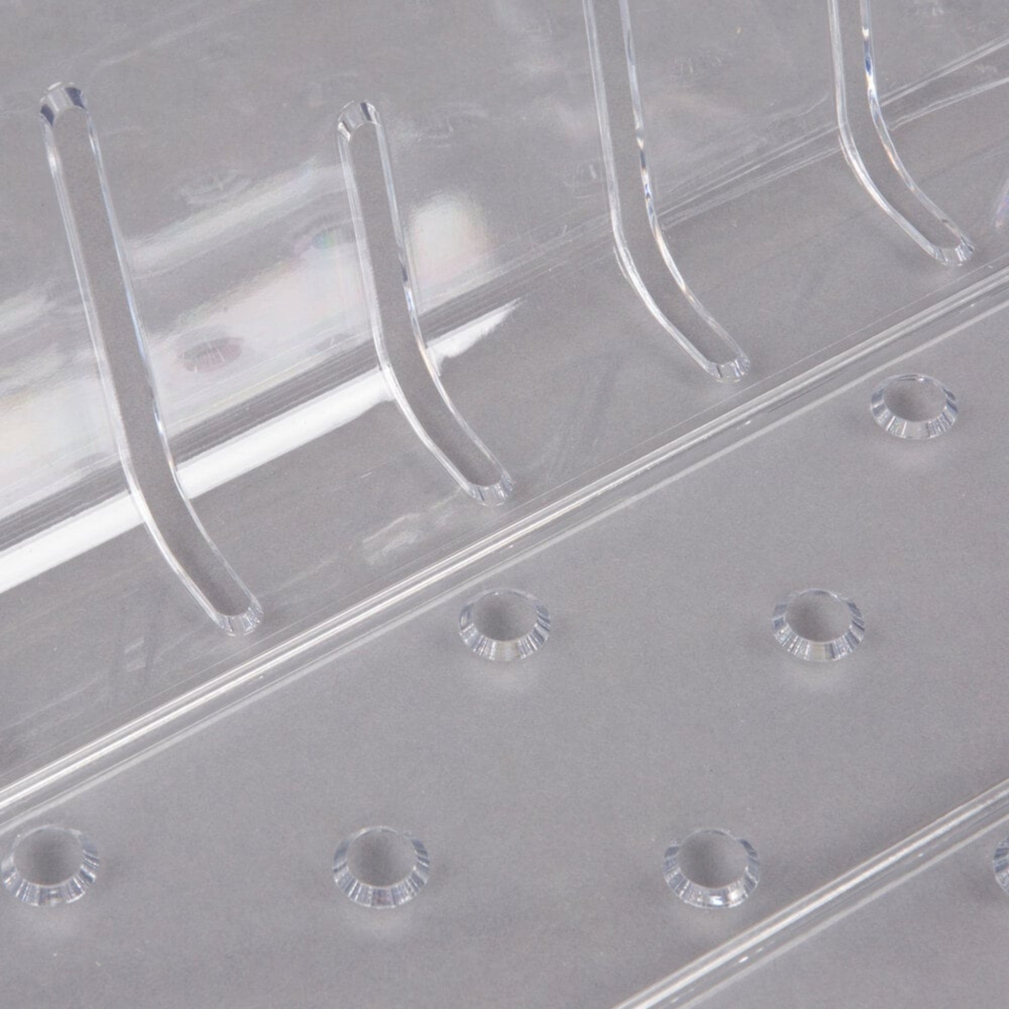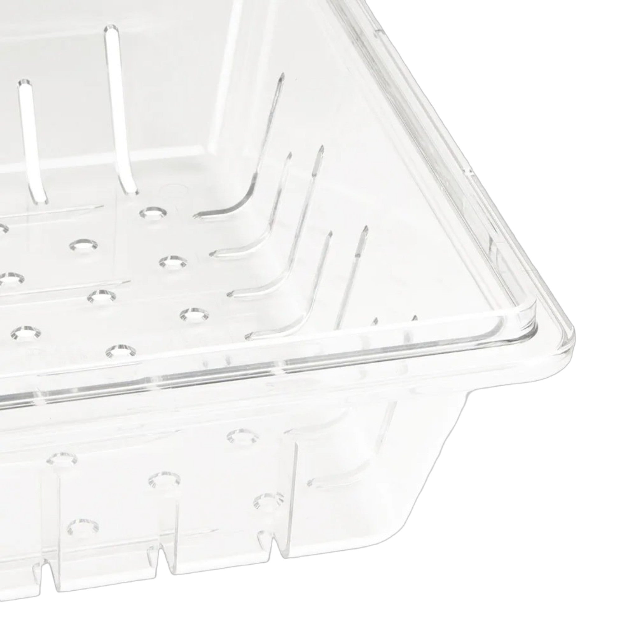 Material resistente: Fabricada en policarbonato transparente de alta durabilidad, es apta para uso rudo y facilita la visibilidad del contenido.
