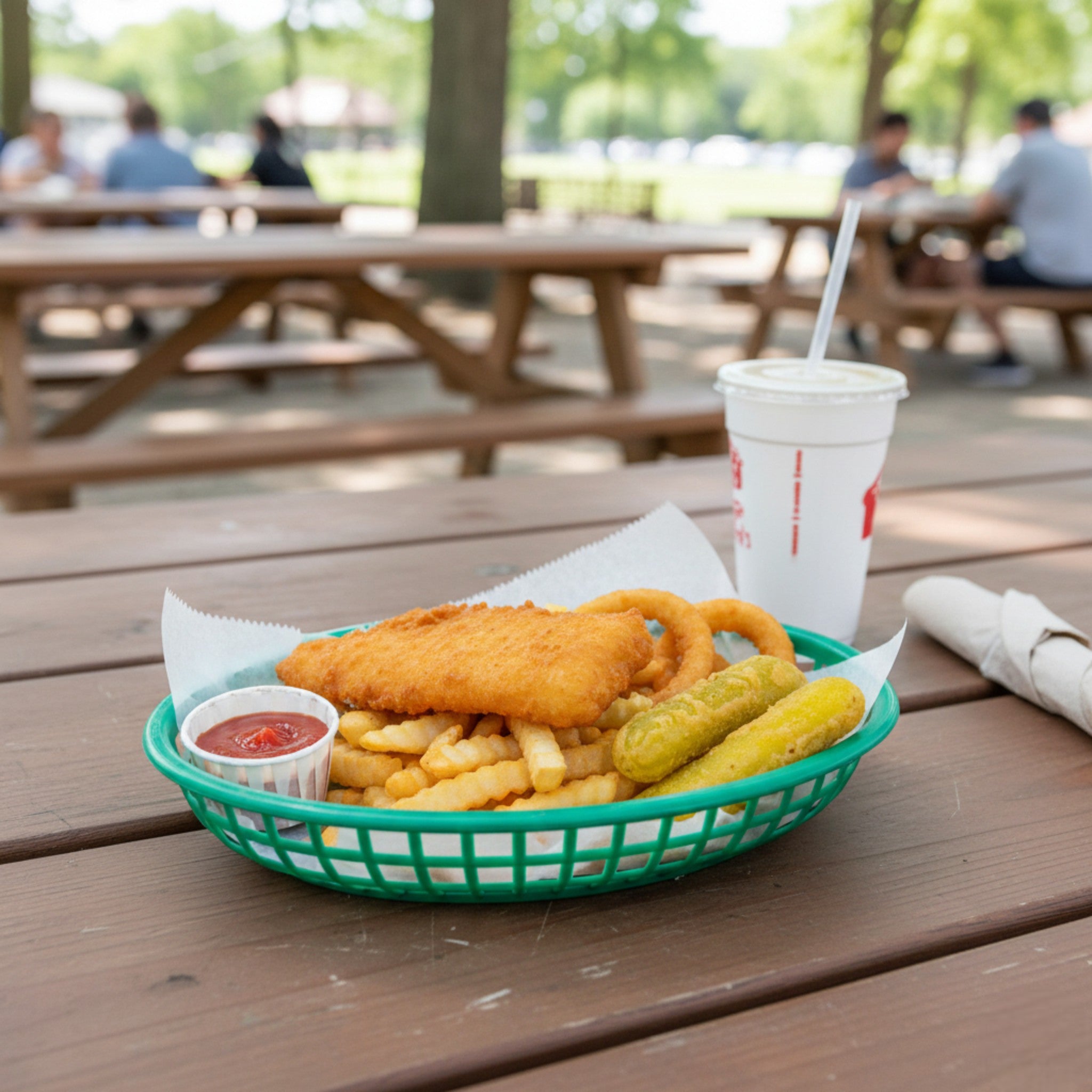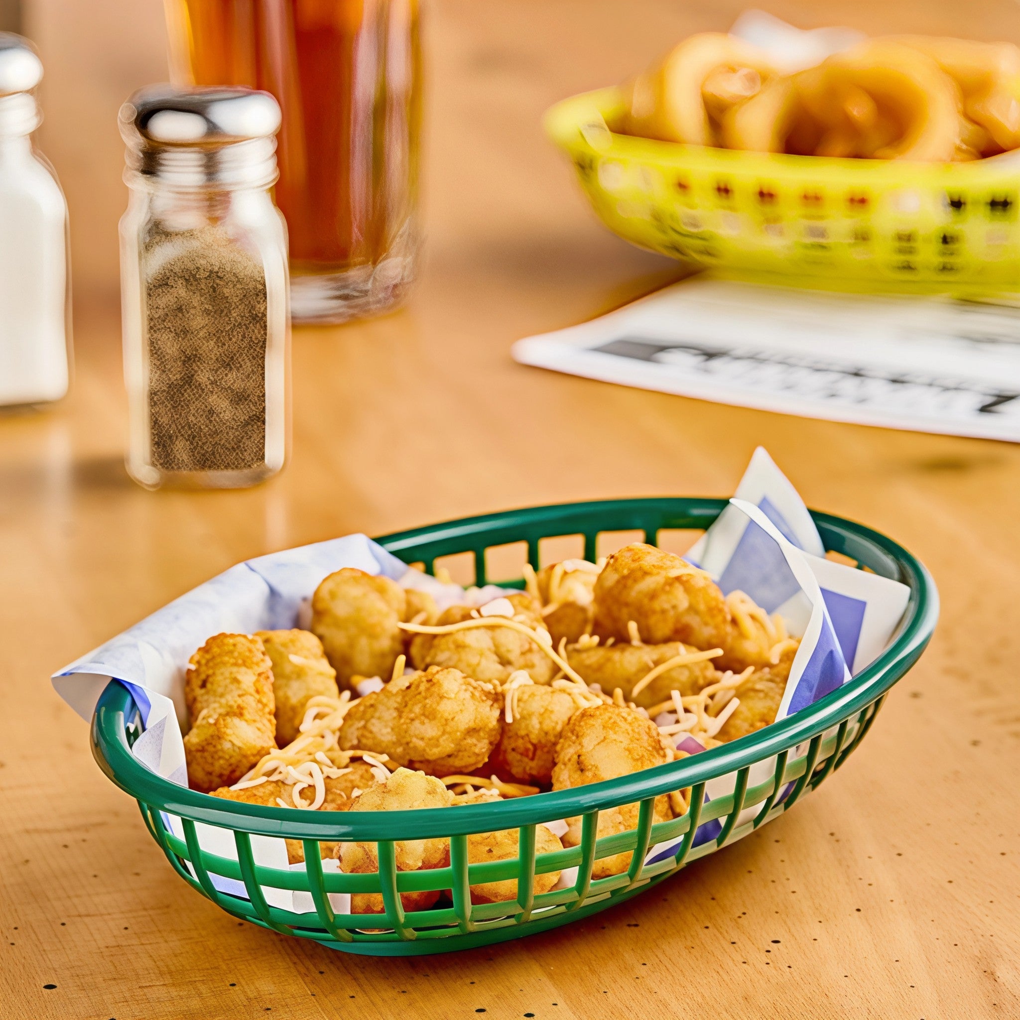 Canasta oval para servicio tipo fast food en color verde, ideal para presentar hamburguesas, alitas, papas y botanas. Su diseño resistente y ligero facilita el uso en restaurantes, cafeterías y food trucks, ofreciendo una presentación práctica y ordenada.