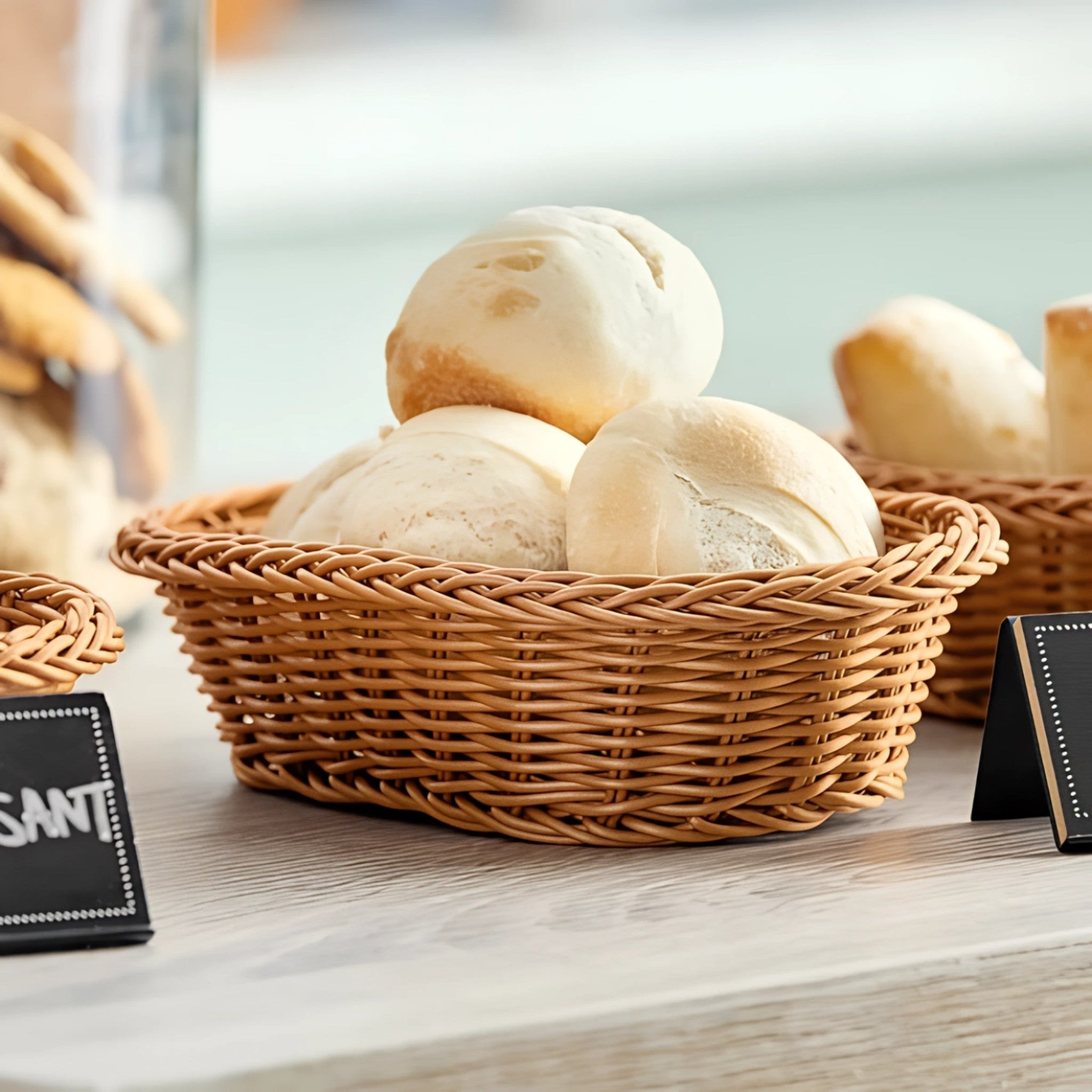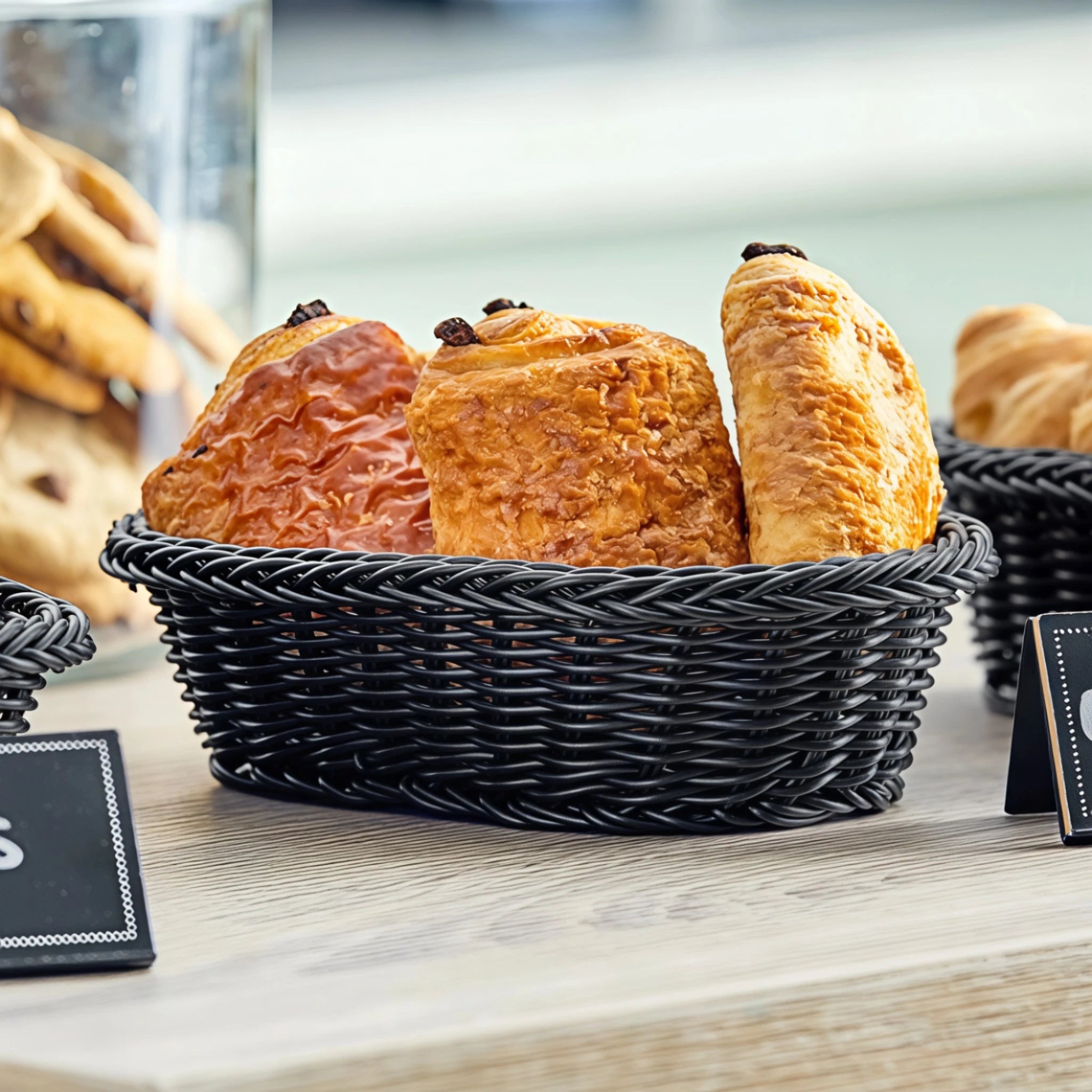 Cesta tejida ovalada disponible en dos colores: negro y café. Ideal para presentar pan, frutas o utensilios en mesas de servicio o bufets gracias a su diseño funcional y elegante.