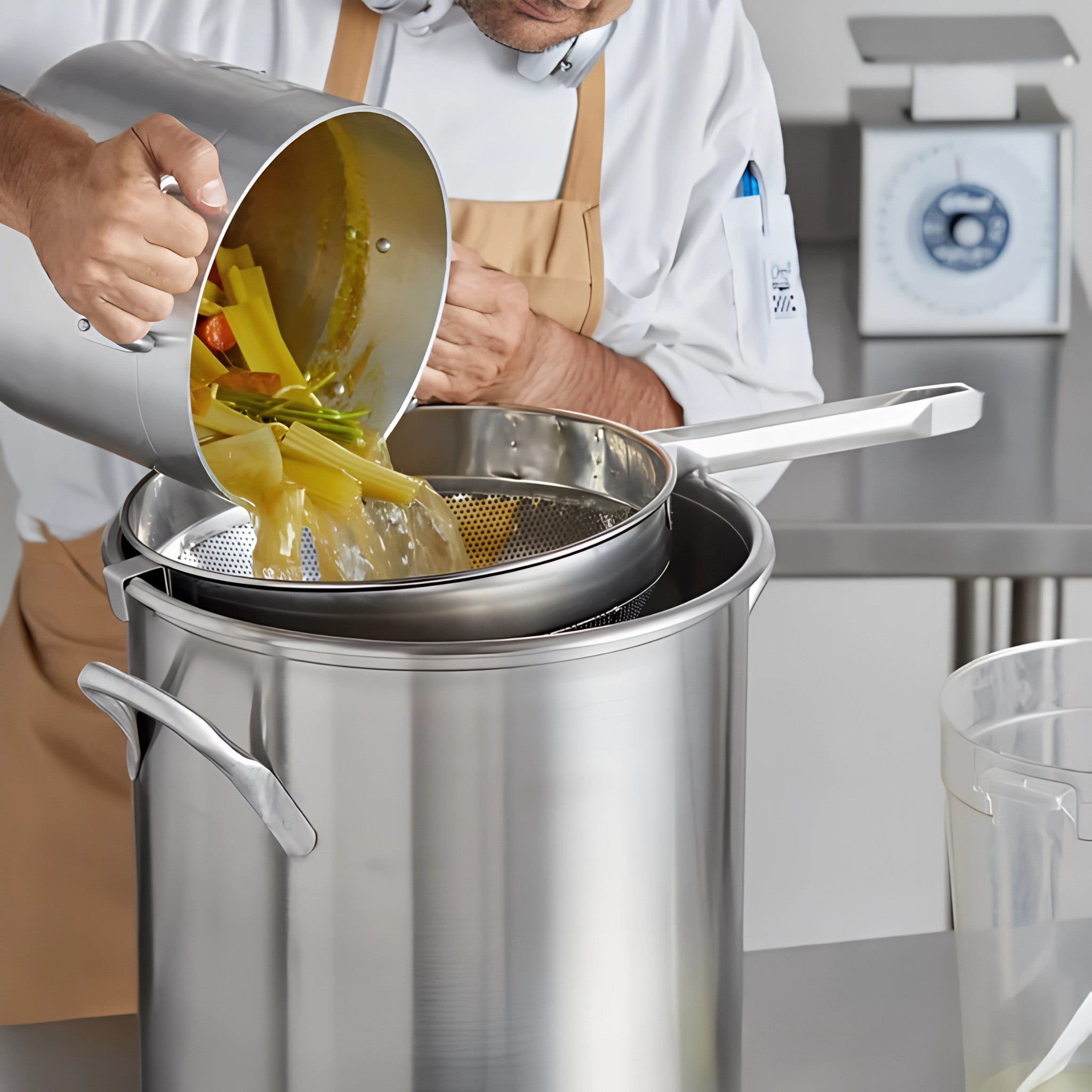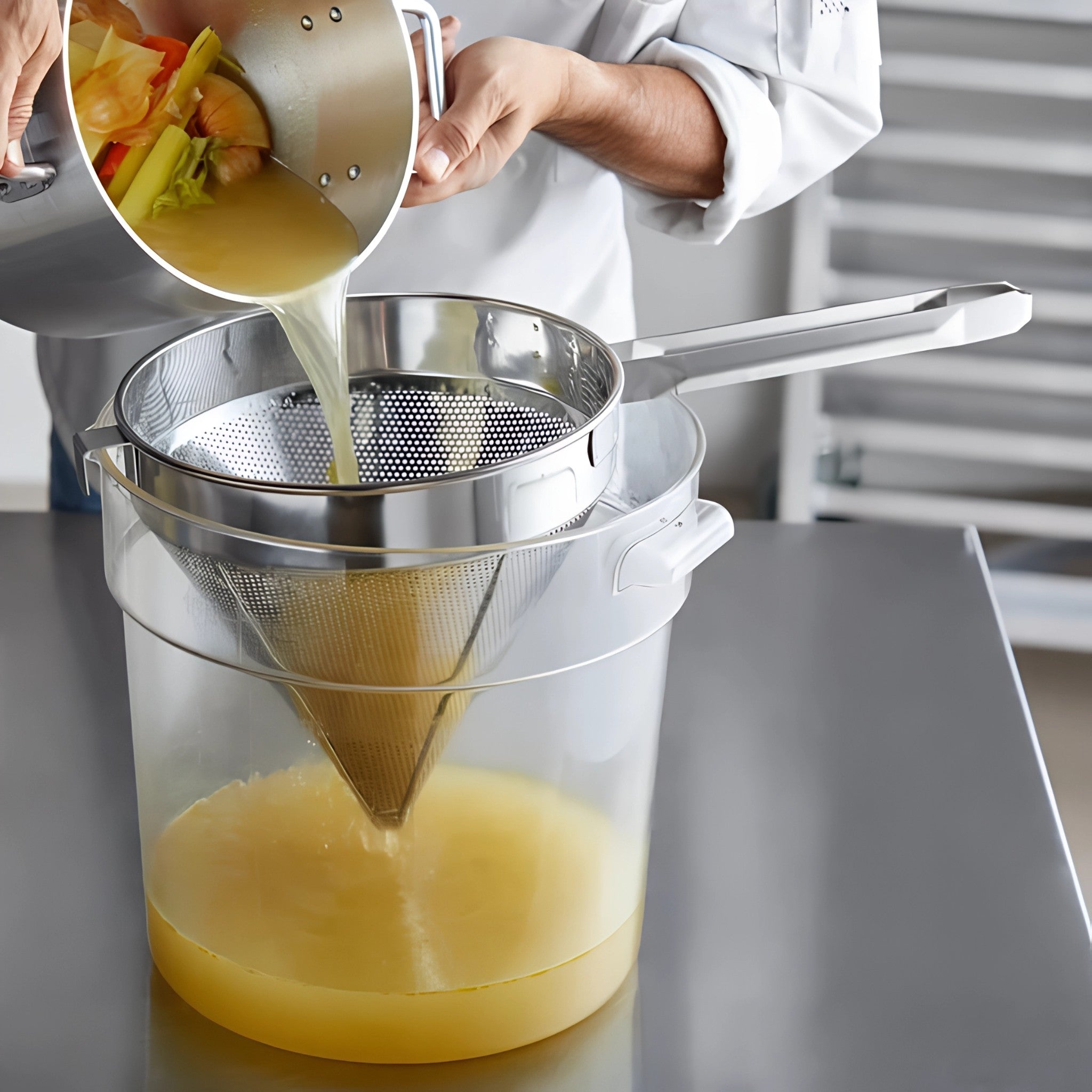 Colador chino de 12" fabricado en acero inoxidable de alta resistencia, diseñado para grandes volúmenes en cocinas profesionales. Su forma cónica permite una filtración rápida y uniforme, ideal para colar caldos, salsas o aceites calientes con máxima eficiencia.