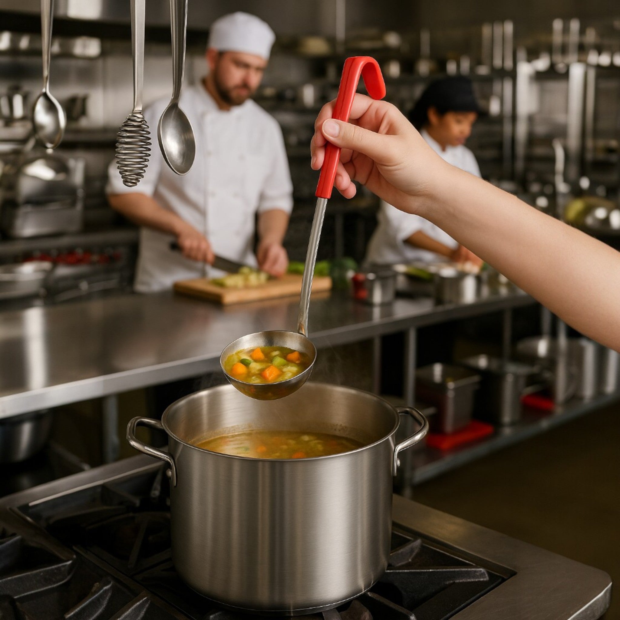 Cucharón para servir de 12 oz ideal para porciones grandes en cocina profesional. Su color rojo permite identificarlo fácilmente por capacidad o uso específico.