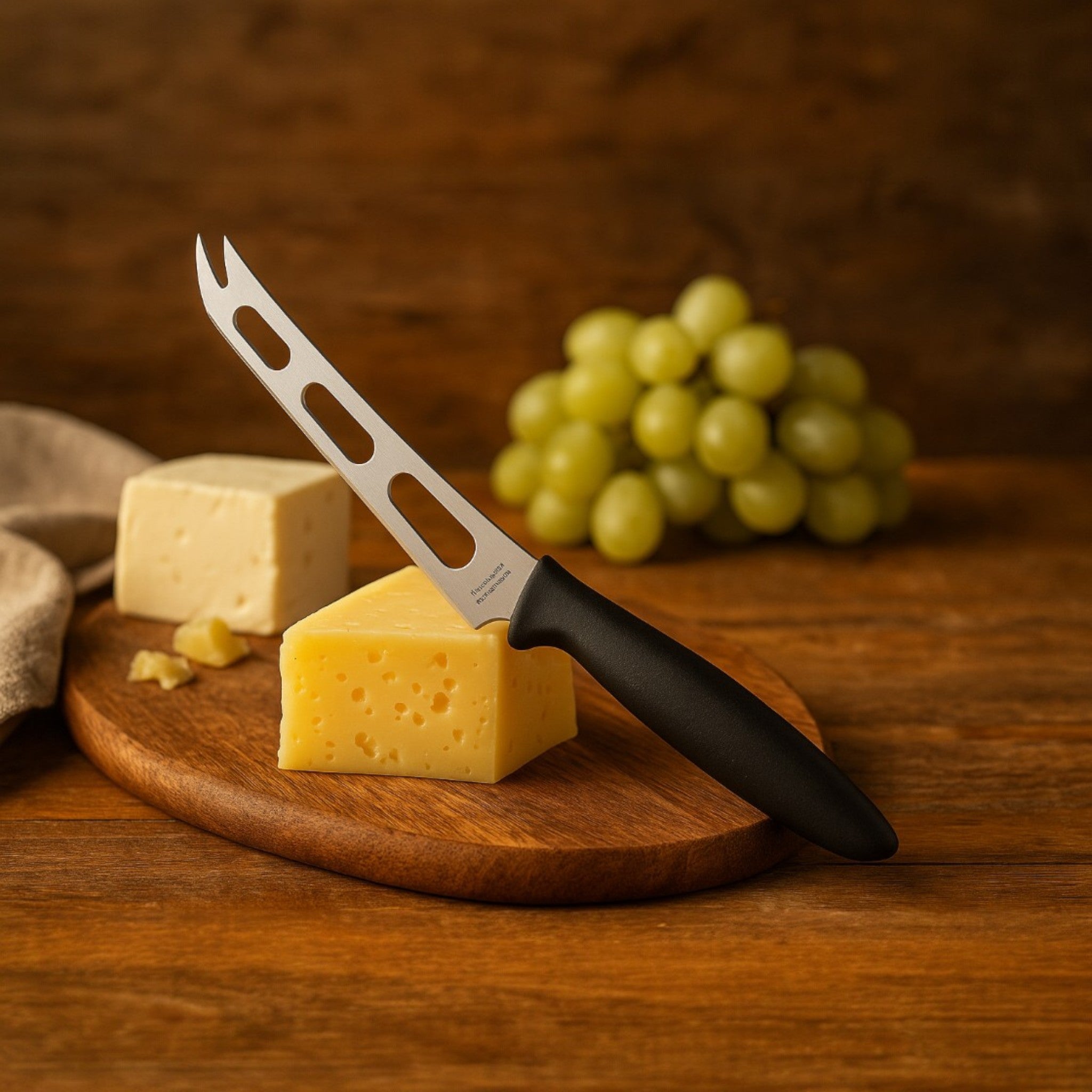 Con una hoja afilada de acero inoxidable y un diseño elegante, este cuchillo es ideal para cortar y servir todo tipo de quesos con precisión y estilo. Su forma y perforaciones evitan que el queso se adhiera, ofreciendo cortes limpios y presentación perfecta.