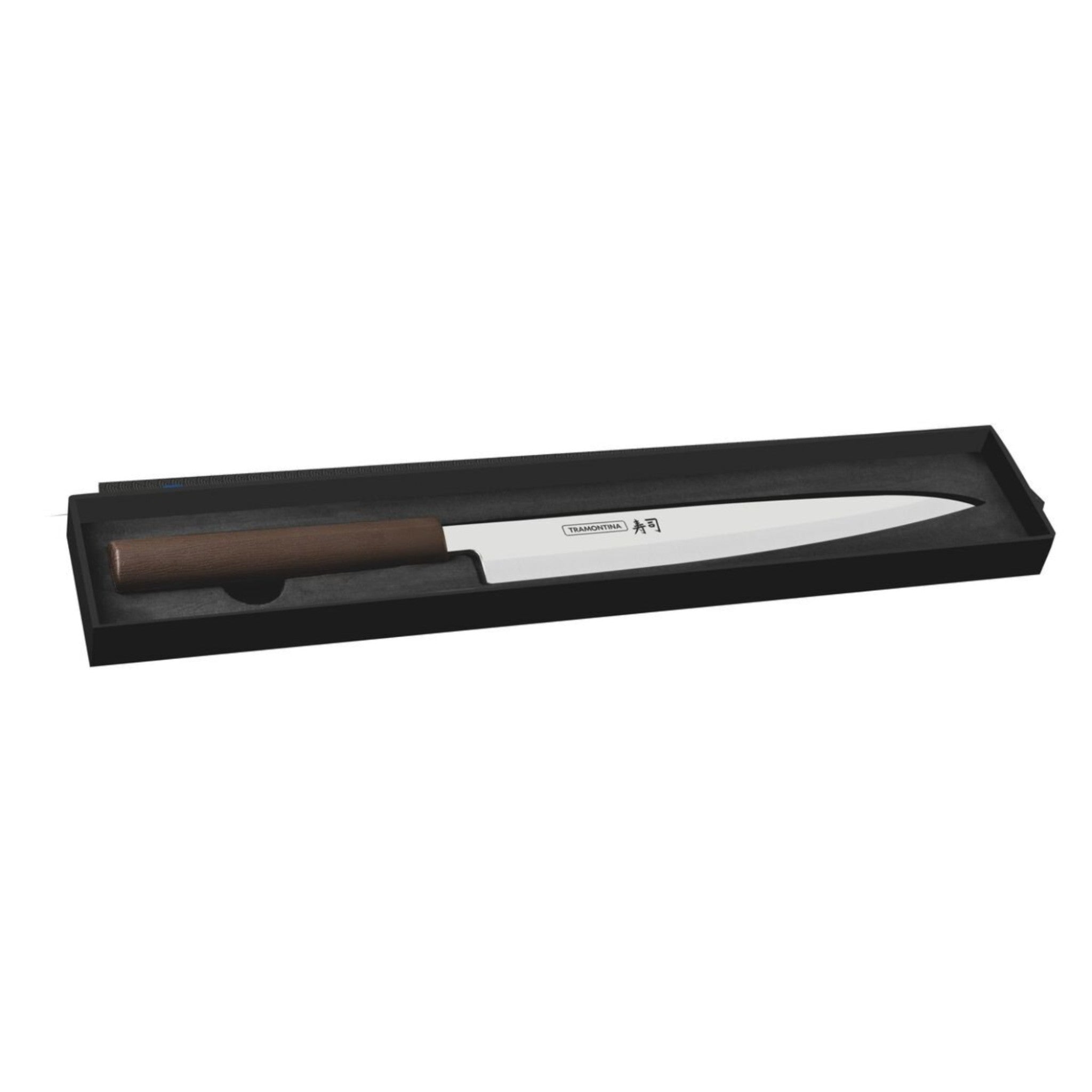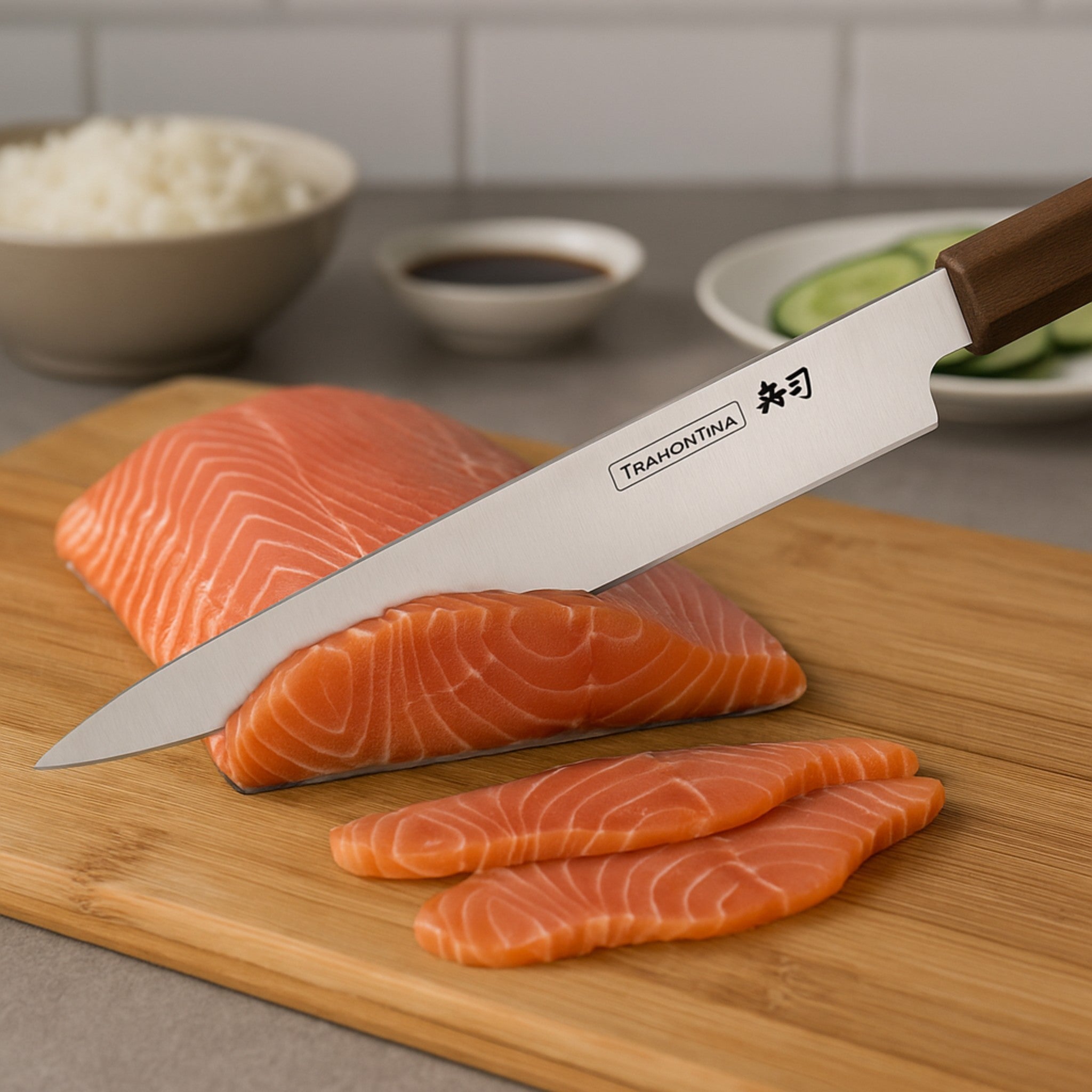 Cuchillo Yanagiba de 9” modelo Sushi Silver, diseñado para cortes largos y precisos. Su hoja estilizada permite un deslizamiento suave, protegiendo la textura del pescado. Ofrece durabilidad, higiene y rendimiento confiable en entornos profesionales.