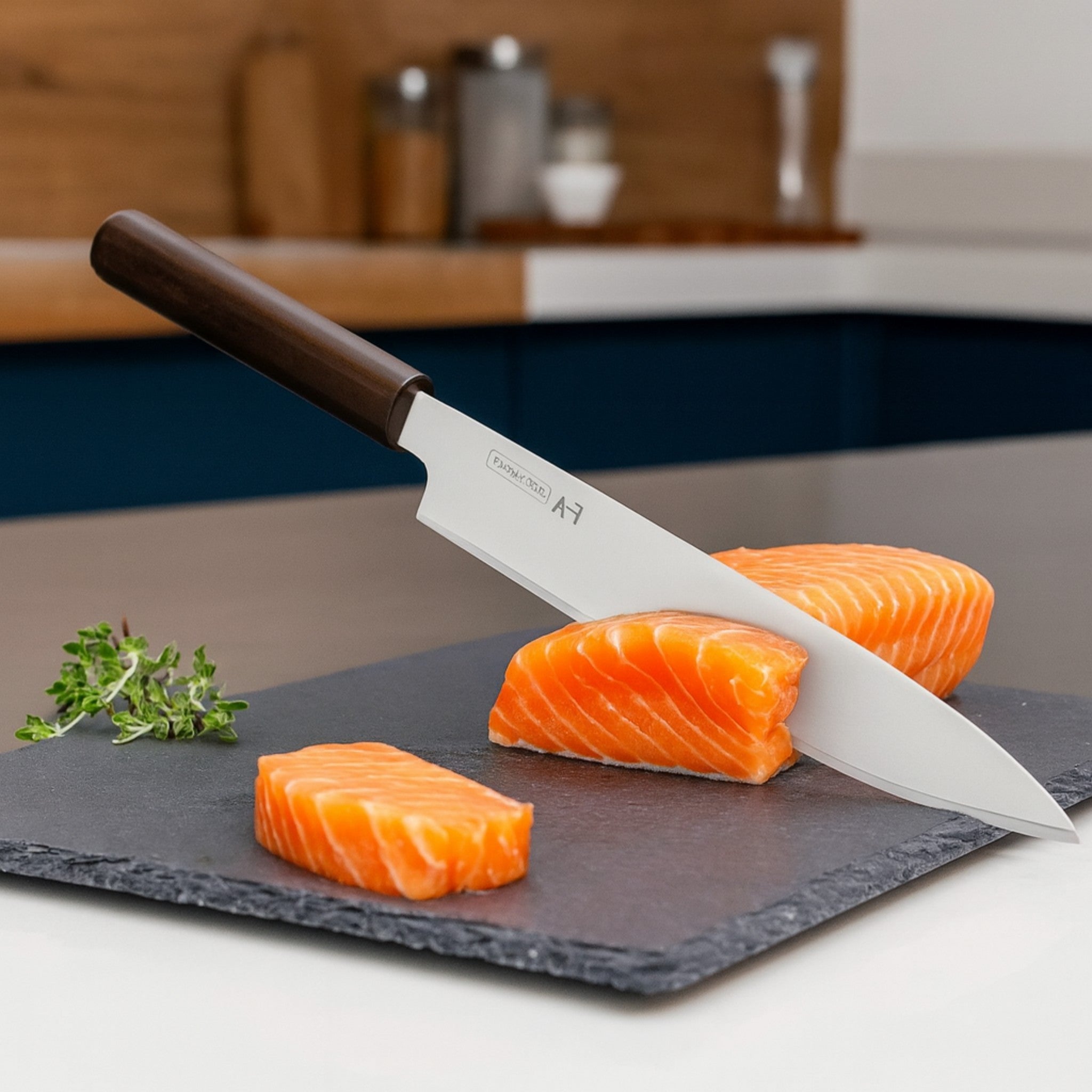 El cuchillo Yanagiba de 13 pulgadas de la línea Sushi Silver está diseñado especialmente para la cocina japonesa profesional. Su hoja larga y ultra afilada permite cortes precisos y delicados en pescados y mariscos, esenciales para preparar sushi y sashimi con perfección.