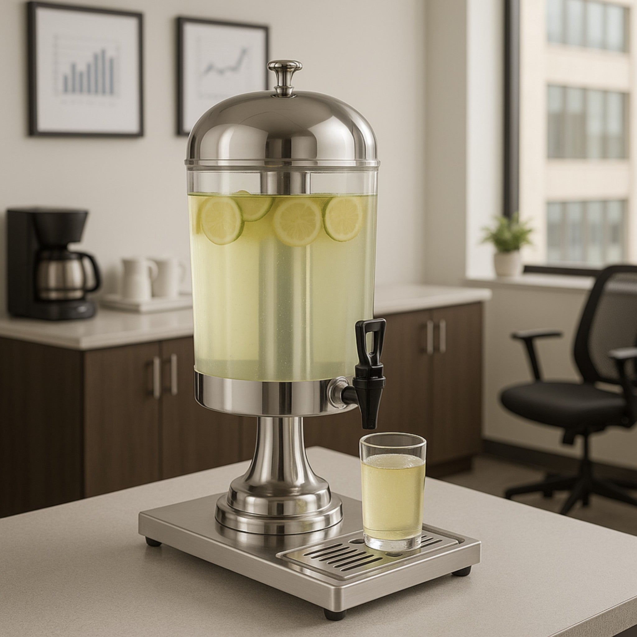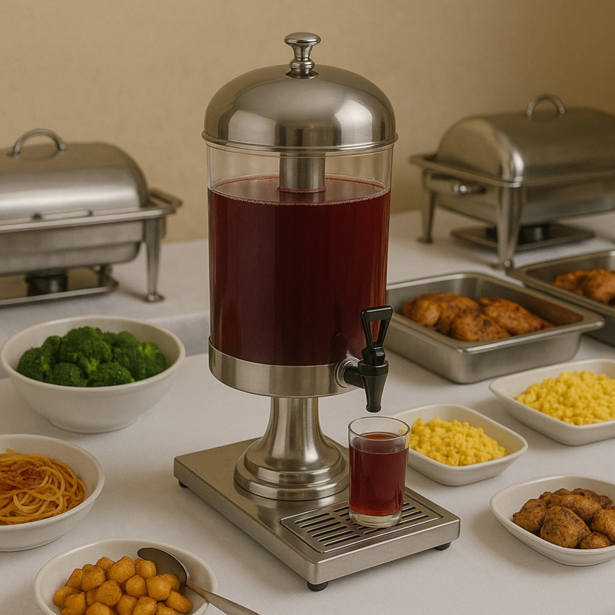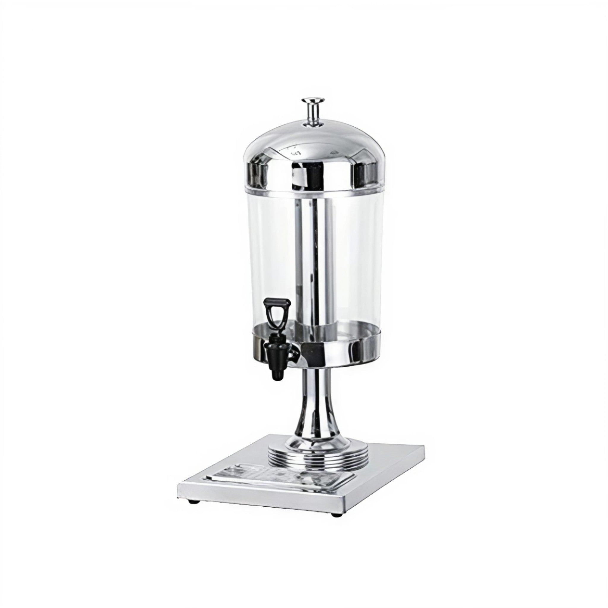 Dispensador de jugo con capacidad de 8 litros, ideal para servir bebidas frías en buffets, hoteles, restaurantes o eventos. Su diseño elegante y funcional lo convierte en una opción práctica y presentable para autoservicio.