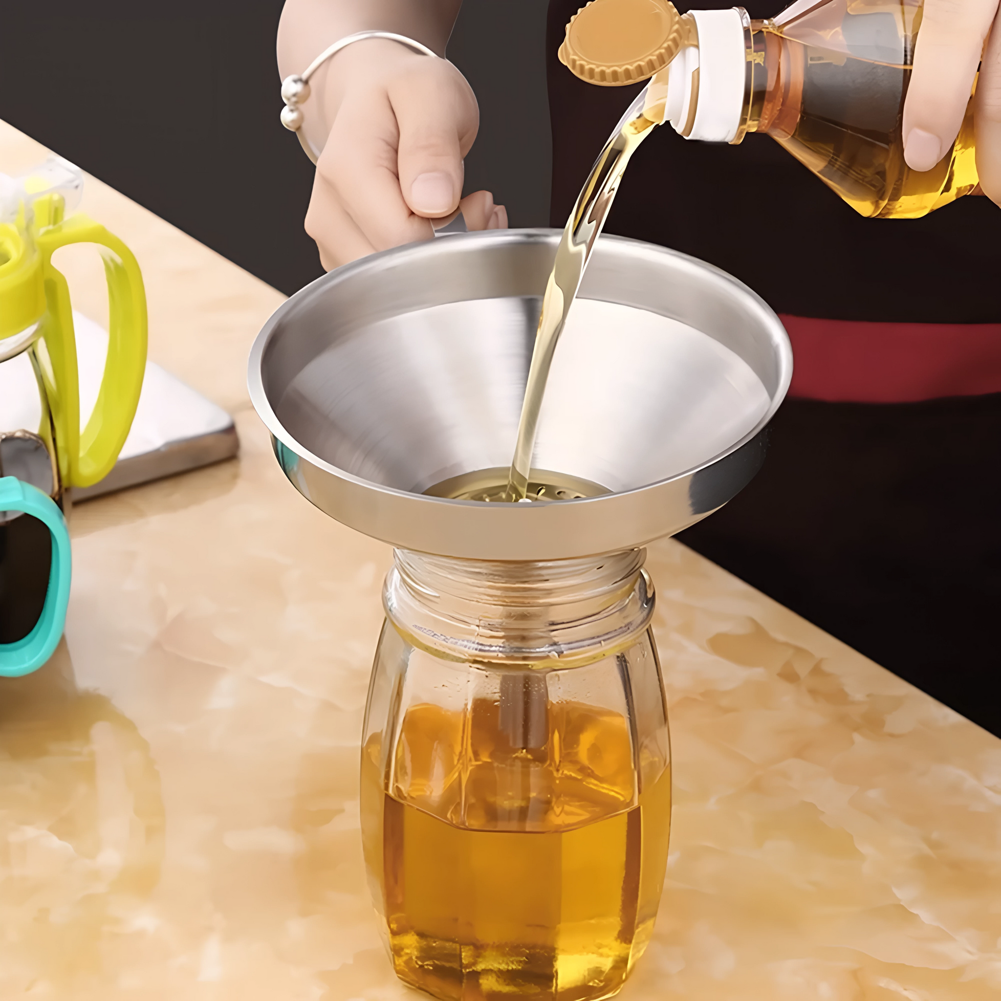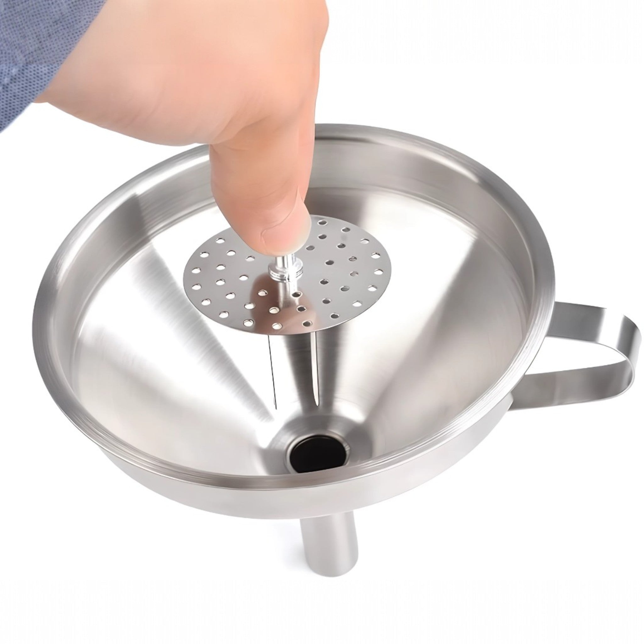 Filtro integrado de acero inoxidable: Retiene sólidos y residuos no deseados al verter líquidos como caldos, aceites o salsas.