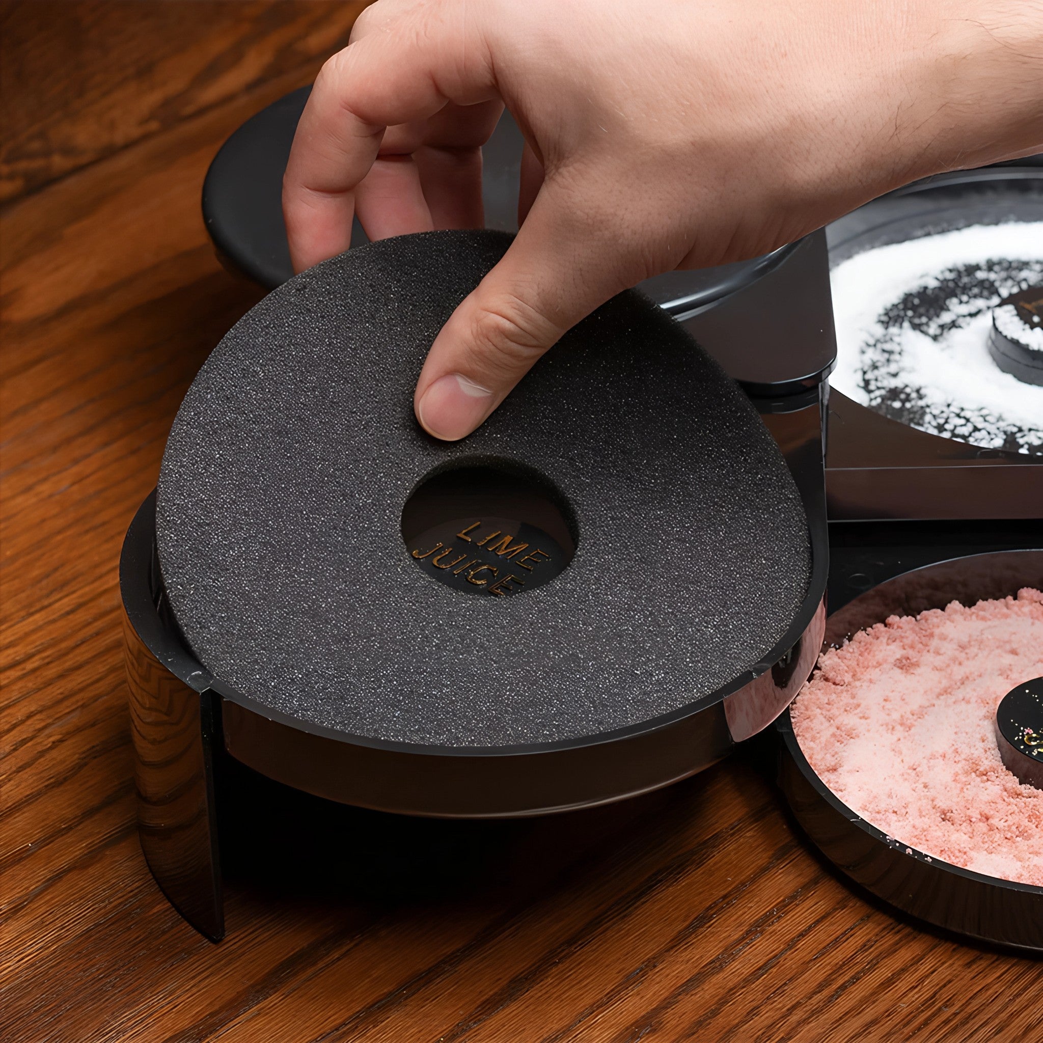 Escarchador para bar fabricado en plástico resistente, ideal para preparar vasos y copas con sal, azúcar u otros bordes decorativos. Su diseño de compartimentos facilita el trabajo rápido y ordenado en barras profesionales.
