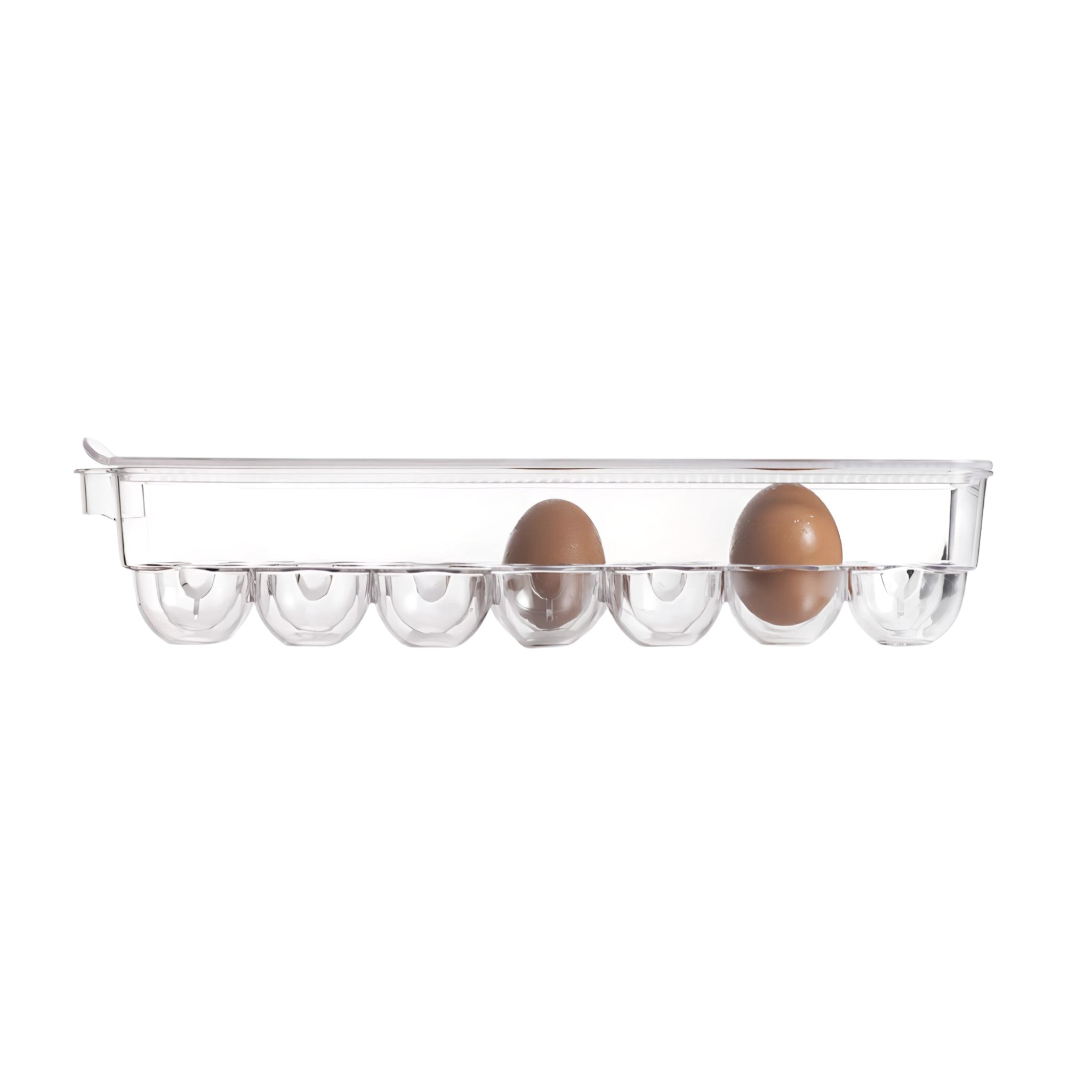 Huevera de plástico con capacidad para 14 piezas, ideal para organizar, almacenar o exhibir huevos de forma higiénica y práctica. Su diseño funcional se adapta a cocinas profesionales, autoservicios o buffets.