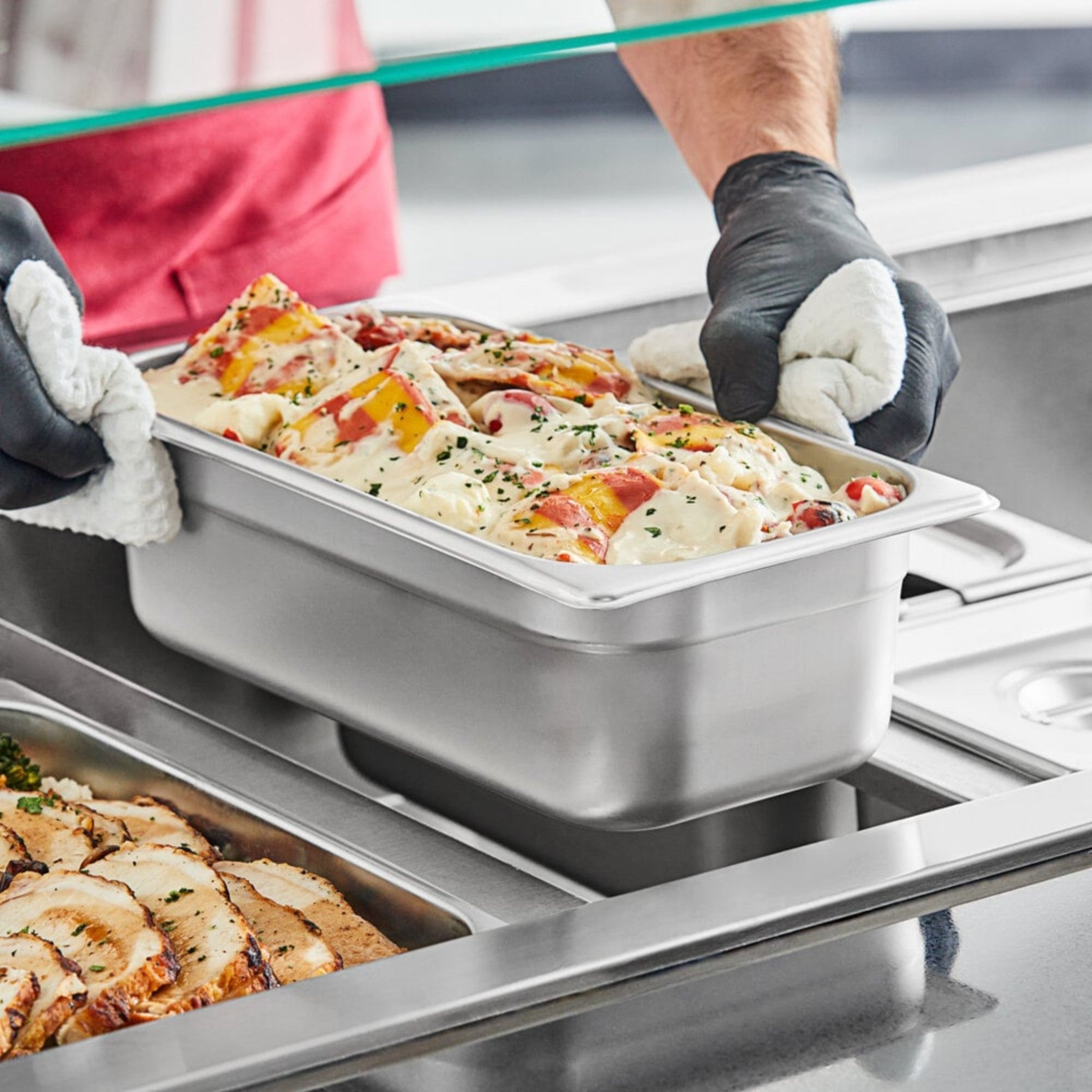 Inserto de acero inoxidable tamaño 1/3 con 4" (10 cm) de profundidad, diseñado para uso intensivo en cocinas profesionales, buffets y mesas de vapor. Fabricado en acero de grado alimenticio con resistencia y durabilidad superiores.