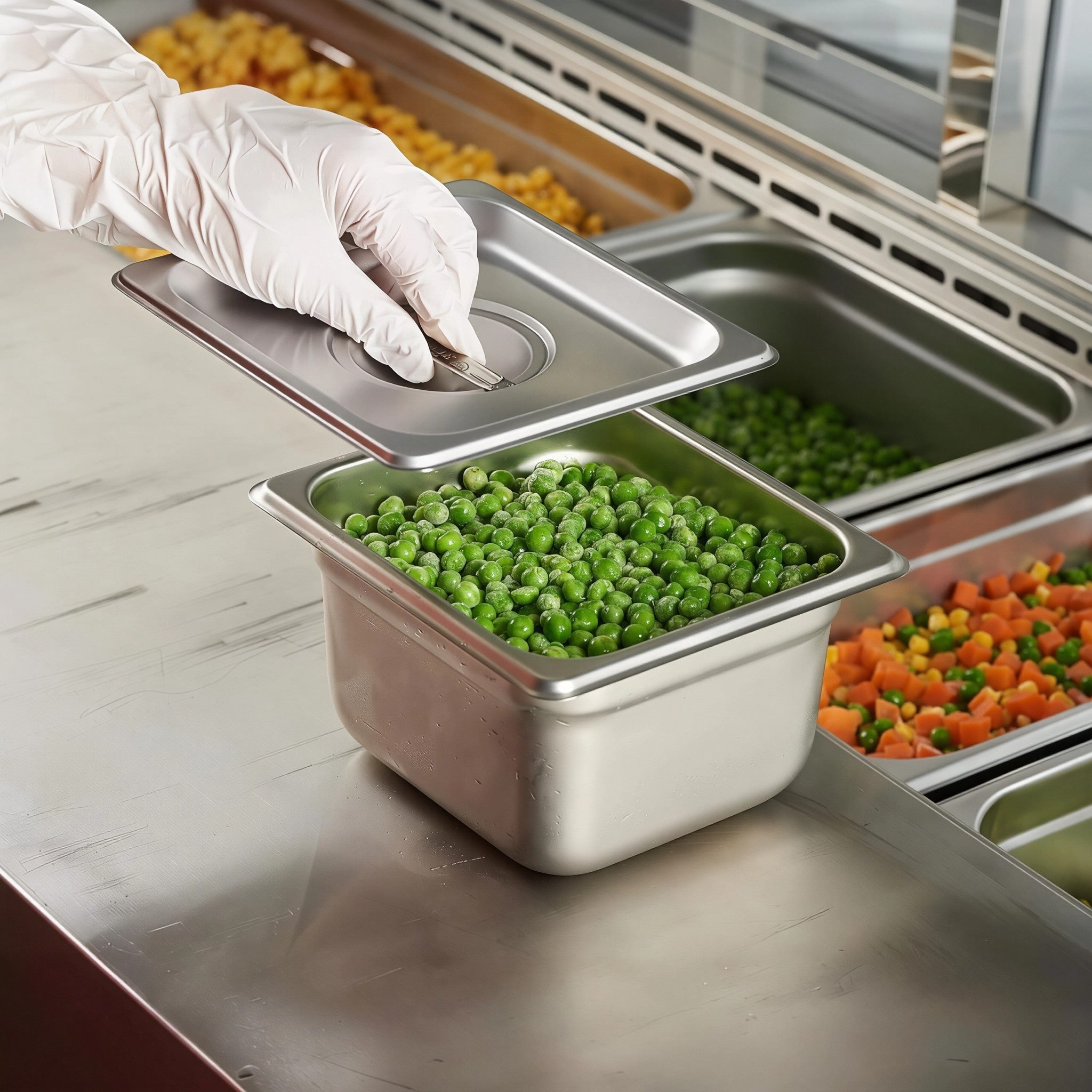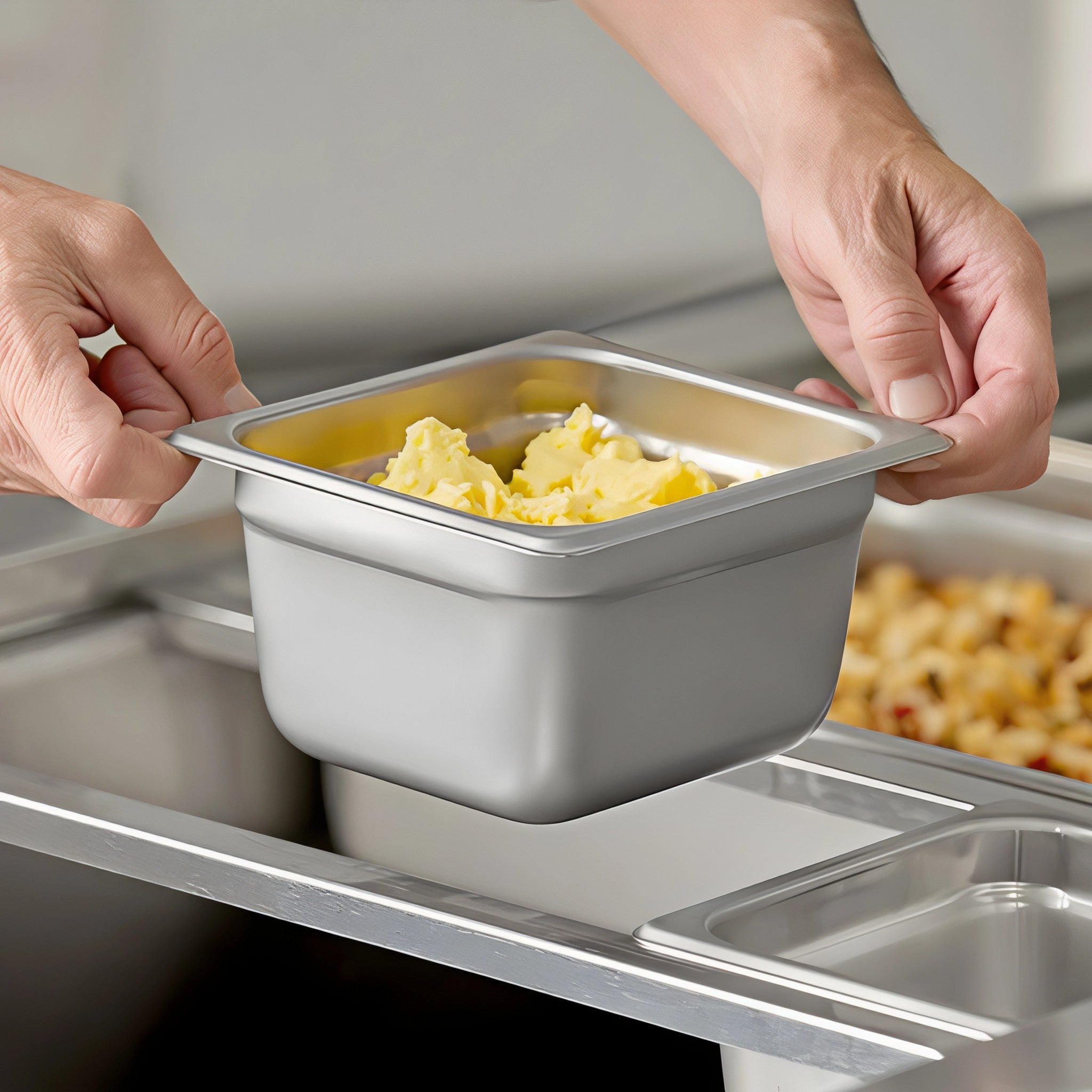 Ideal para cocinas profesionales y servicios de buffet, este inserto de acero inoxidable tamaño 1/6x10 ofrece resistencia, higiene y compatibilidad con estándares NSF. Su diseño facilita la organización y conservación de alimentos en estaciones de trabajo, mesas frías o baños maría.