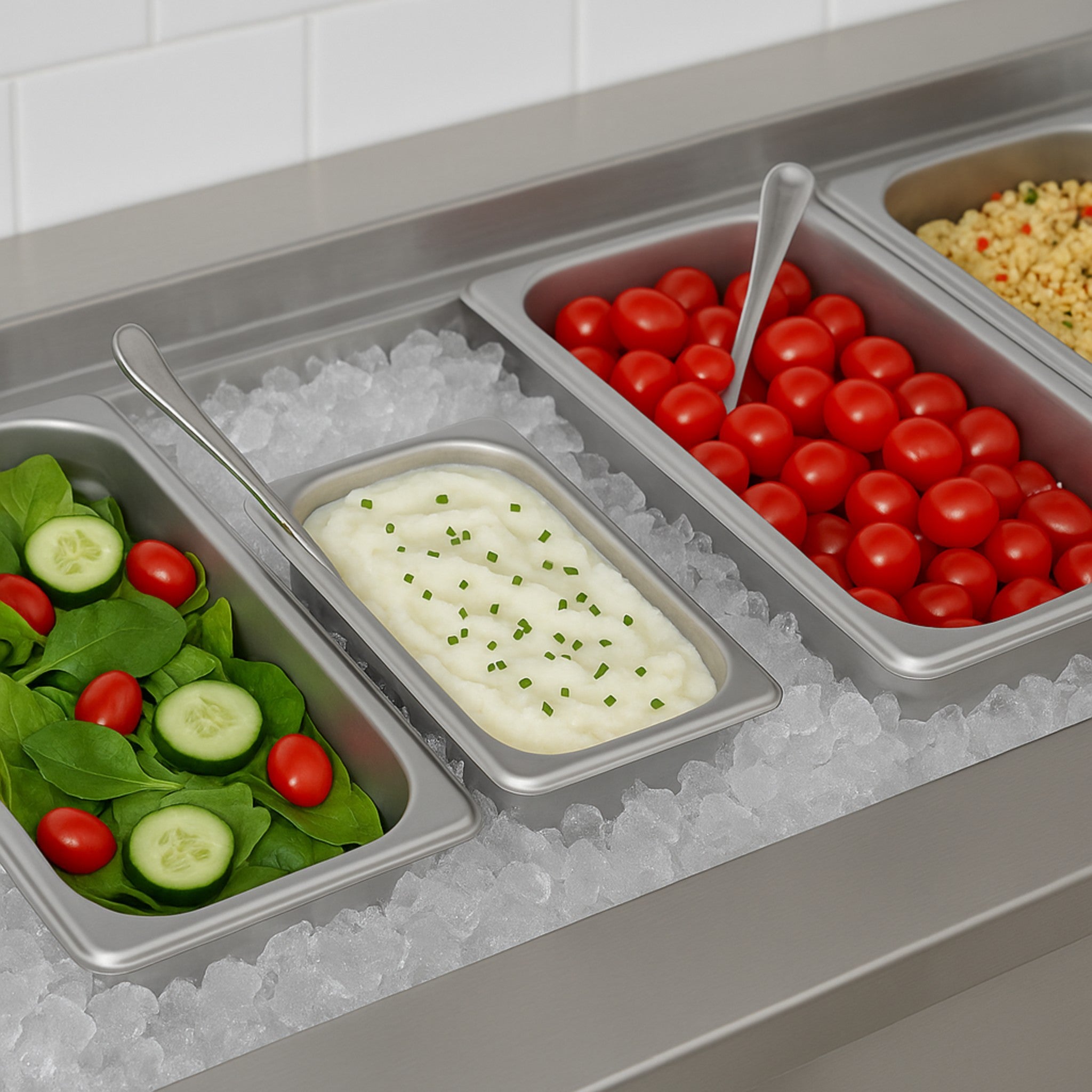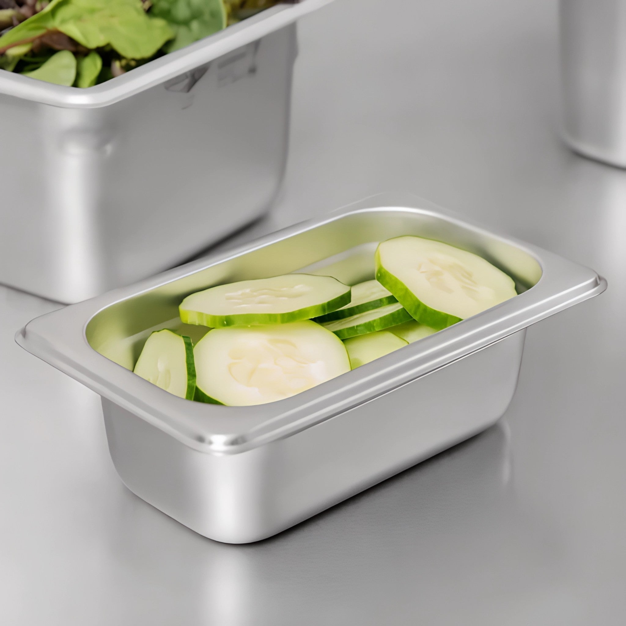 Inserto de acero inoxidable tamaño 1/9 con profundidad de 6.5 cm, certificado NSF para uso seguro en contacto con alimentos. Diseñado para resistir el uso intensivo en cocinas profesionales, manteniendo la higiene y durabilidad.