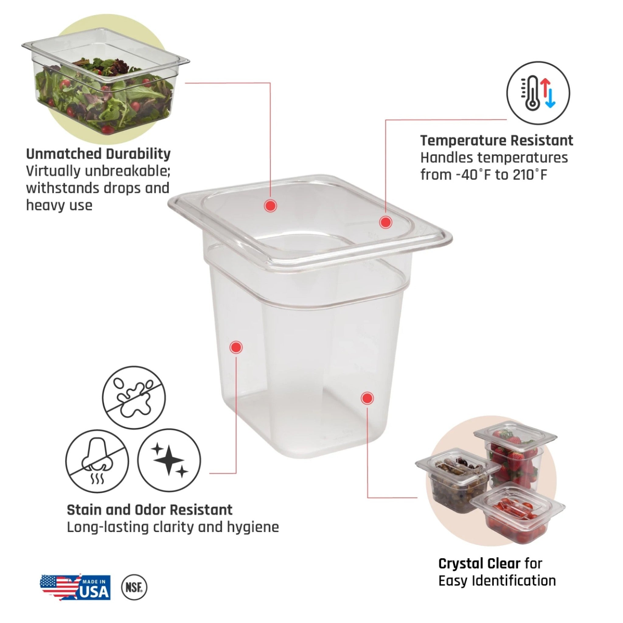 • Transparente y duradero: Fabricado en policarbonato resistente, permite identificar fácilmente el contenido, no se mancha y es apto para lavavajillas.