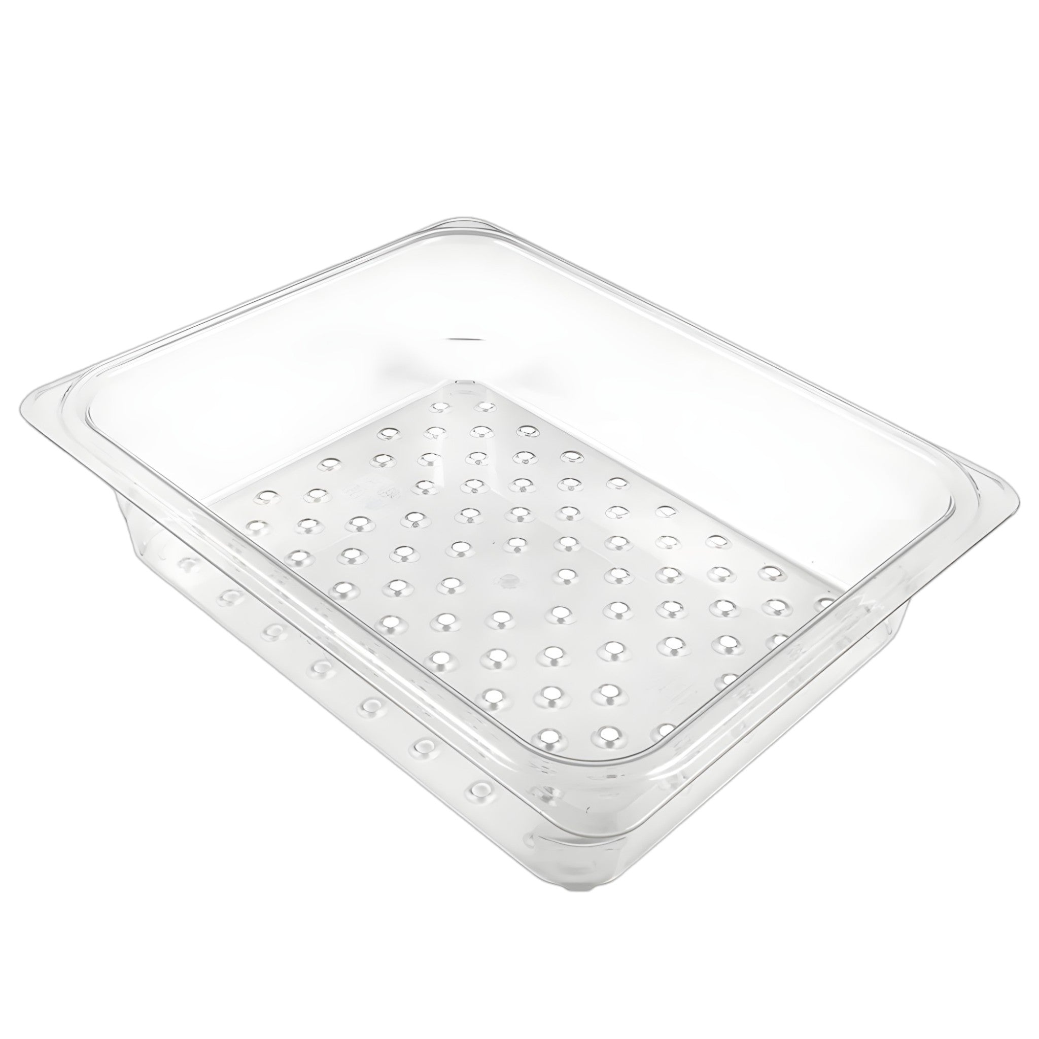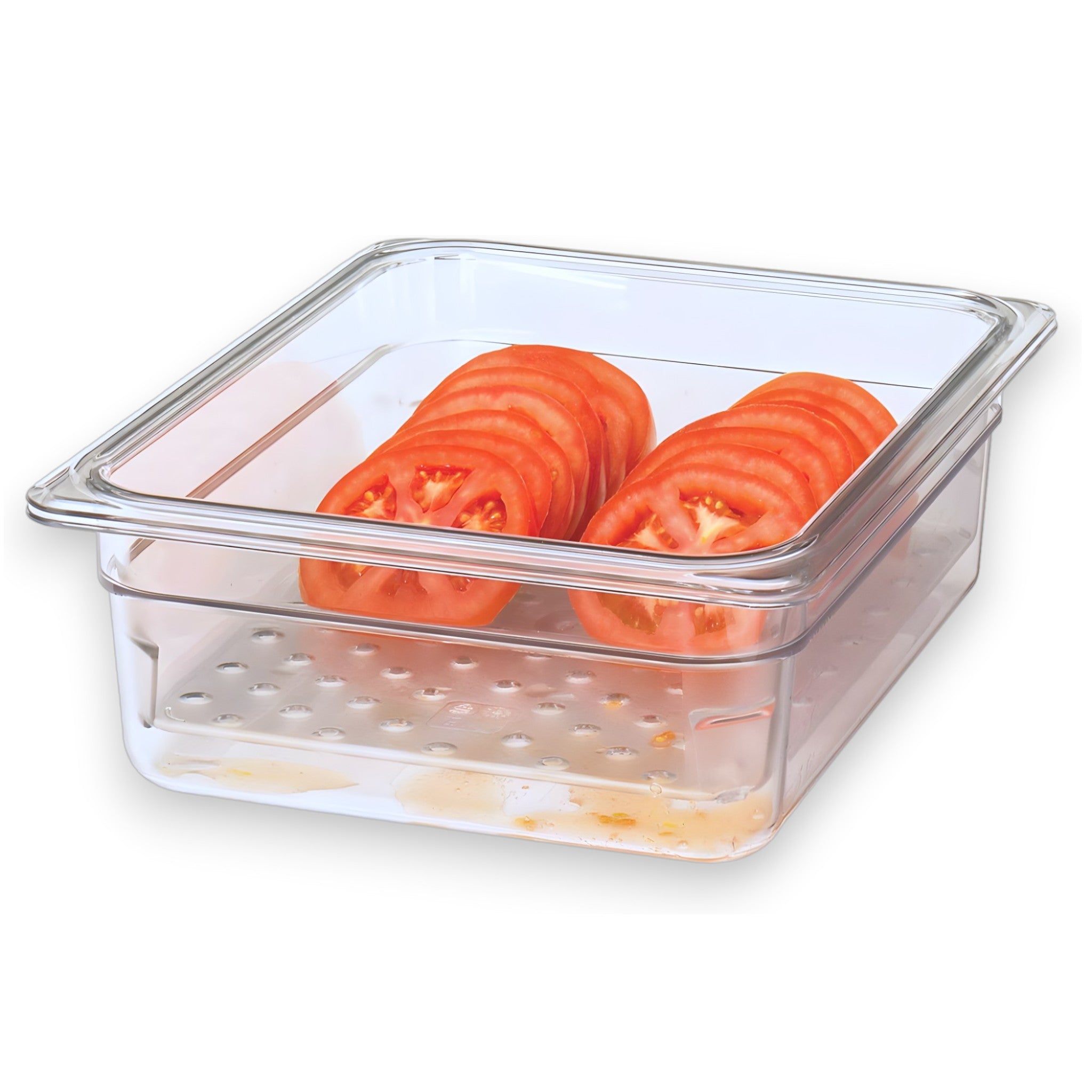 Drenado efectivo: Las perforaciones permiten que el líquido se separe de los alimentos, manteniéndolos frescos y listos para usar.