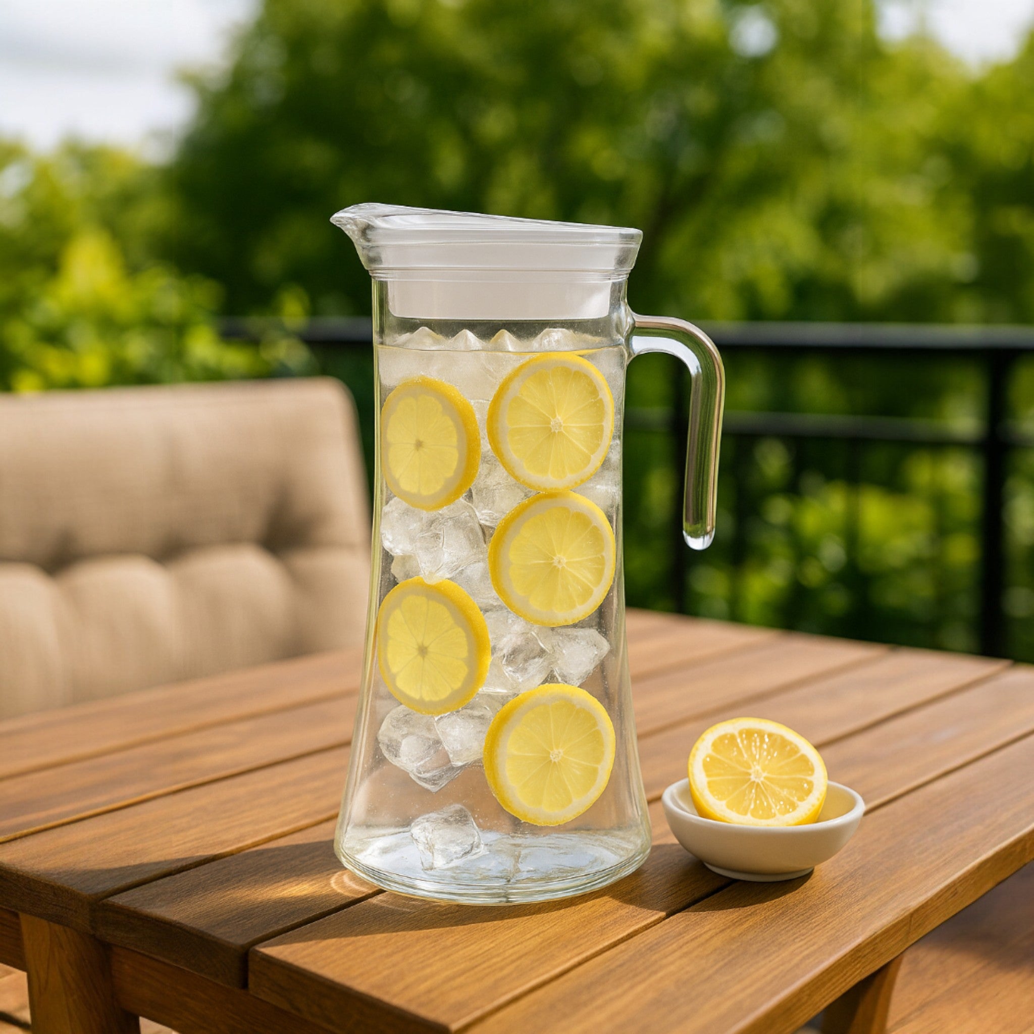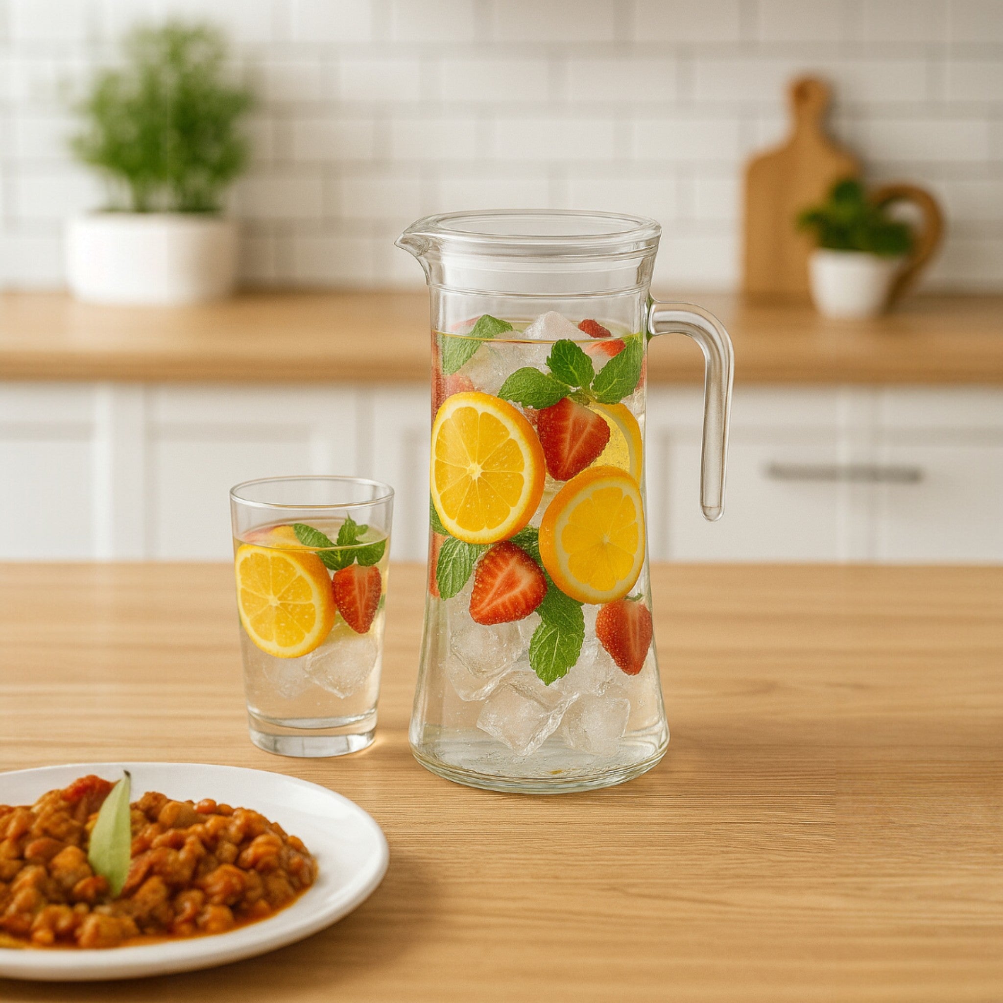 Jarra de vidrio LAV modelo Truva con capacidad de 1.4 litros. Su diseño elegante y resistente la hace ideal para servir agua, jugos, limonadas o bebidas frías en restaurantes, hoteles o uso doméstico. Cuenta con asa ergonómica y pico vertedor que facilitan el servicio sin derrames.