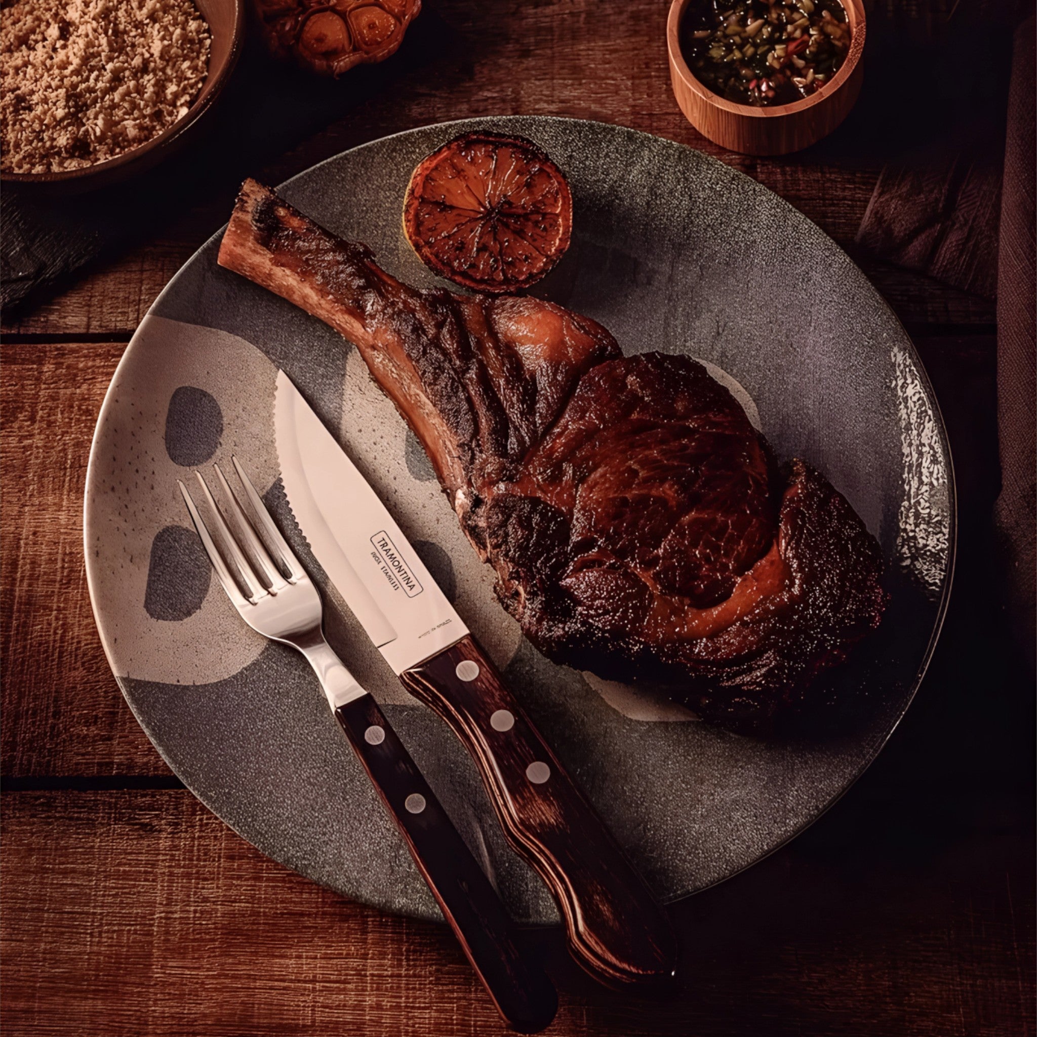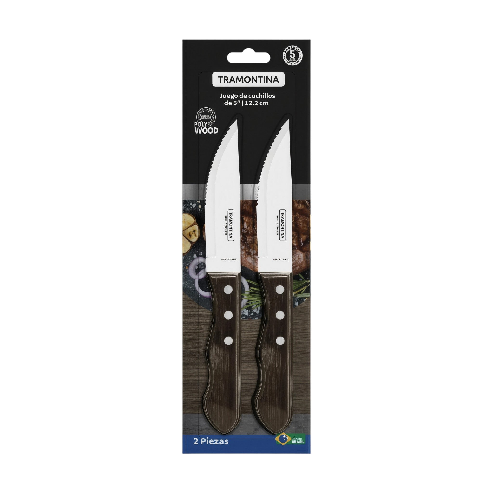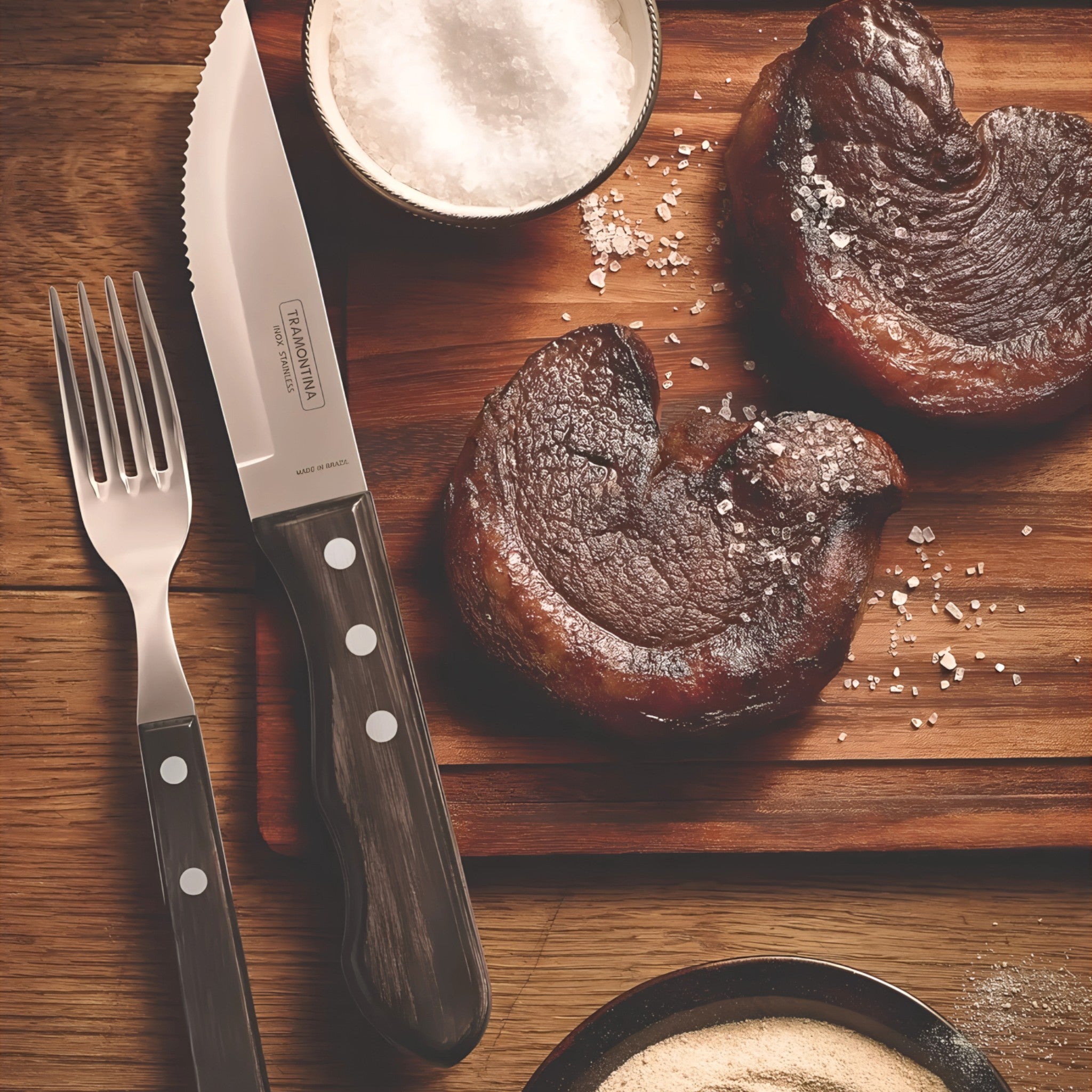 Set de cuchillos de mesa tamaño jumbo, ideales para cortes gruesos de carne, asados o parrilladas. Fabricados con hoja de acero inoxidable y mango Polywood tratado para resistir humedad, impactos y altas temperaturas. Diseñados para uso continuo en restaurantes, parrillas u hogares exigentes.