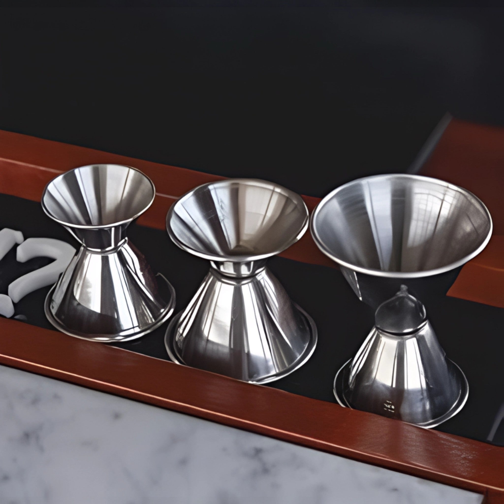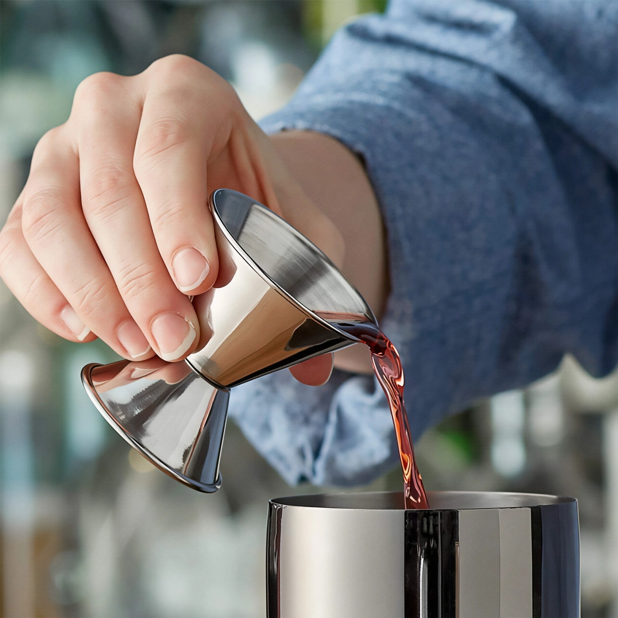 Jigger de acero inoxidable “Travessa” con doble medida de 2 oz y 1/2 oz, ideal para coctelería profesional en barras y restaurantes. Su precisión ayuda a estandarizar recetas y mejorar la velocidad de servicio.