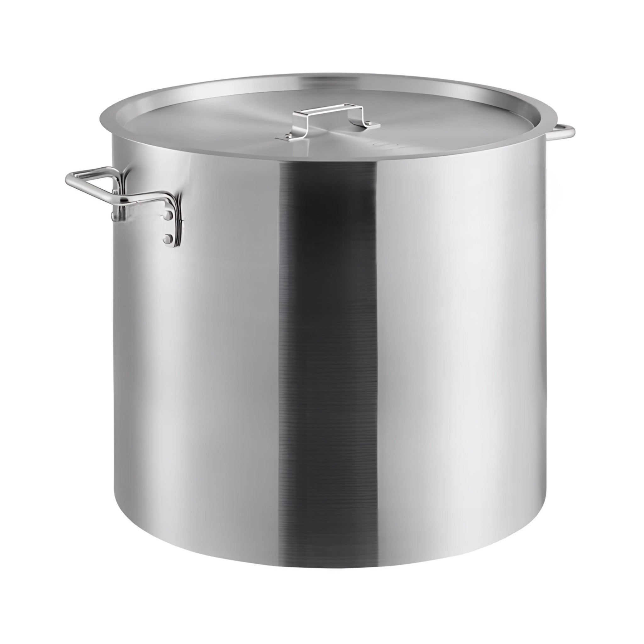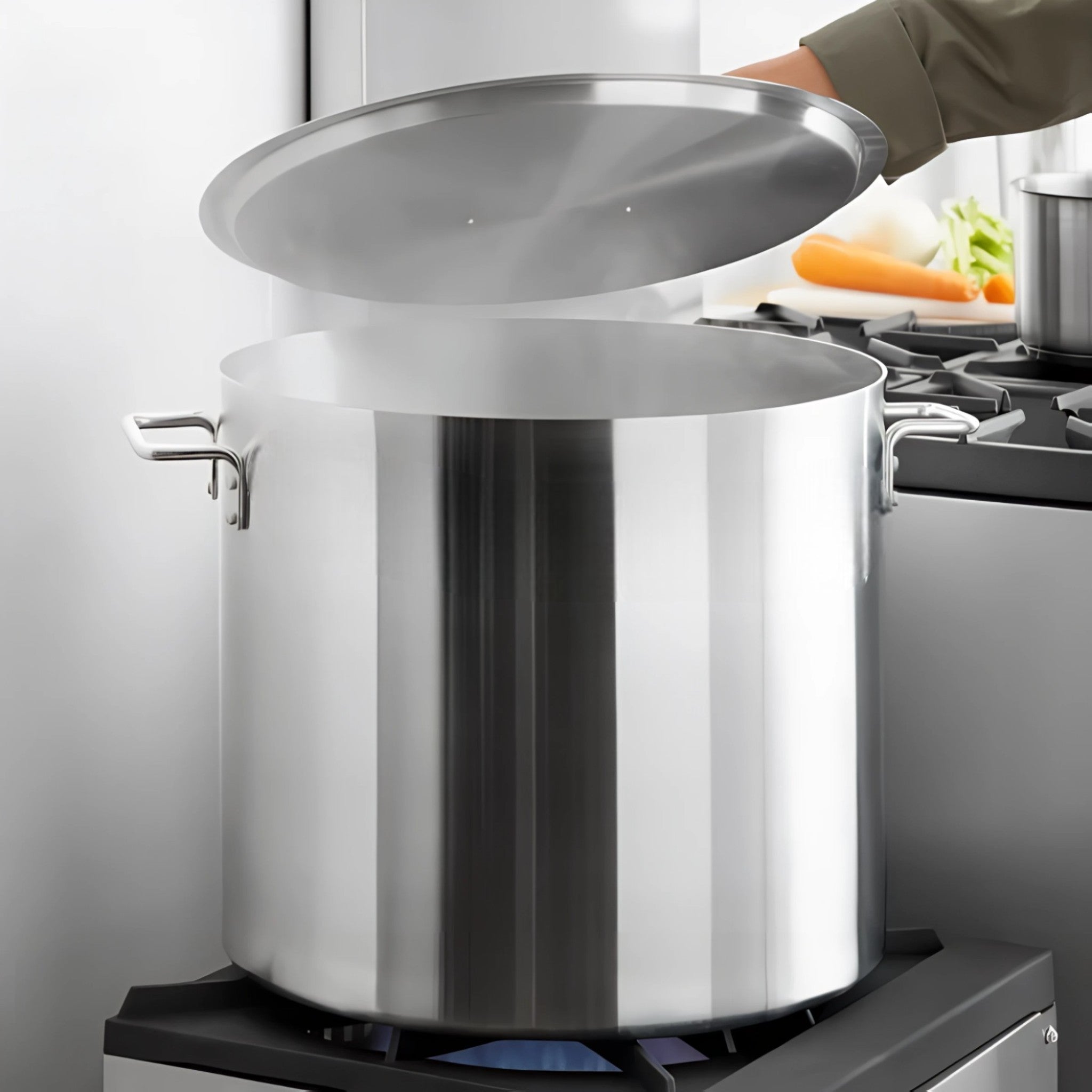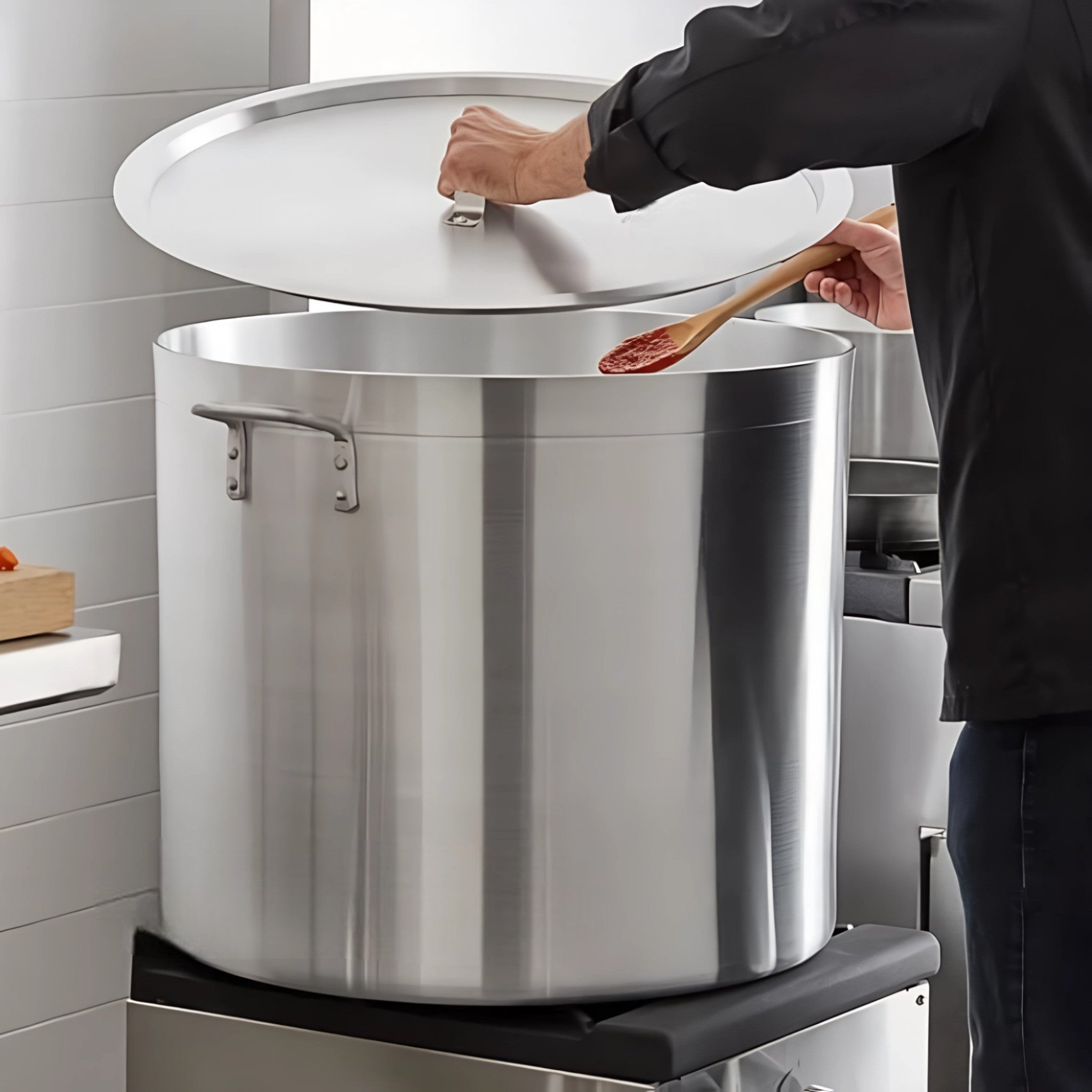 Una olla de aluminio de altísima capacidad, diseñada para operaciones de cocina a gran escala. Su construcción robusta y funcionalidad la hacen indispensable en entornos profesionales e industriales.