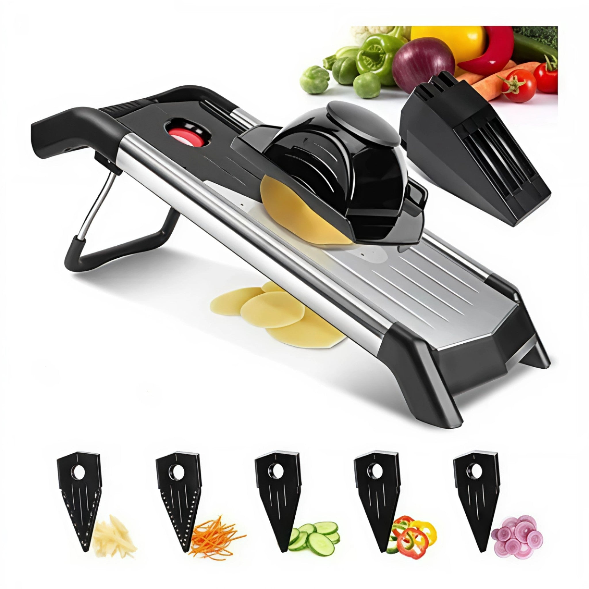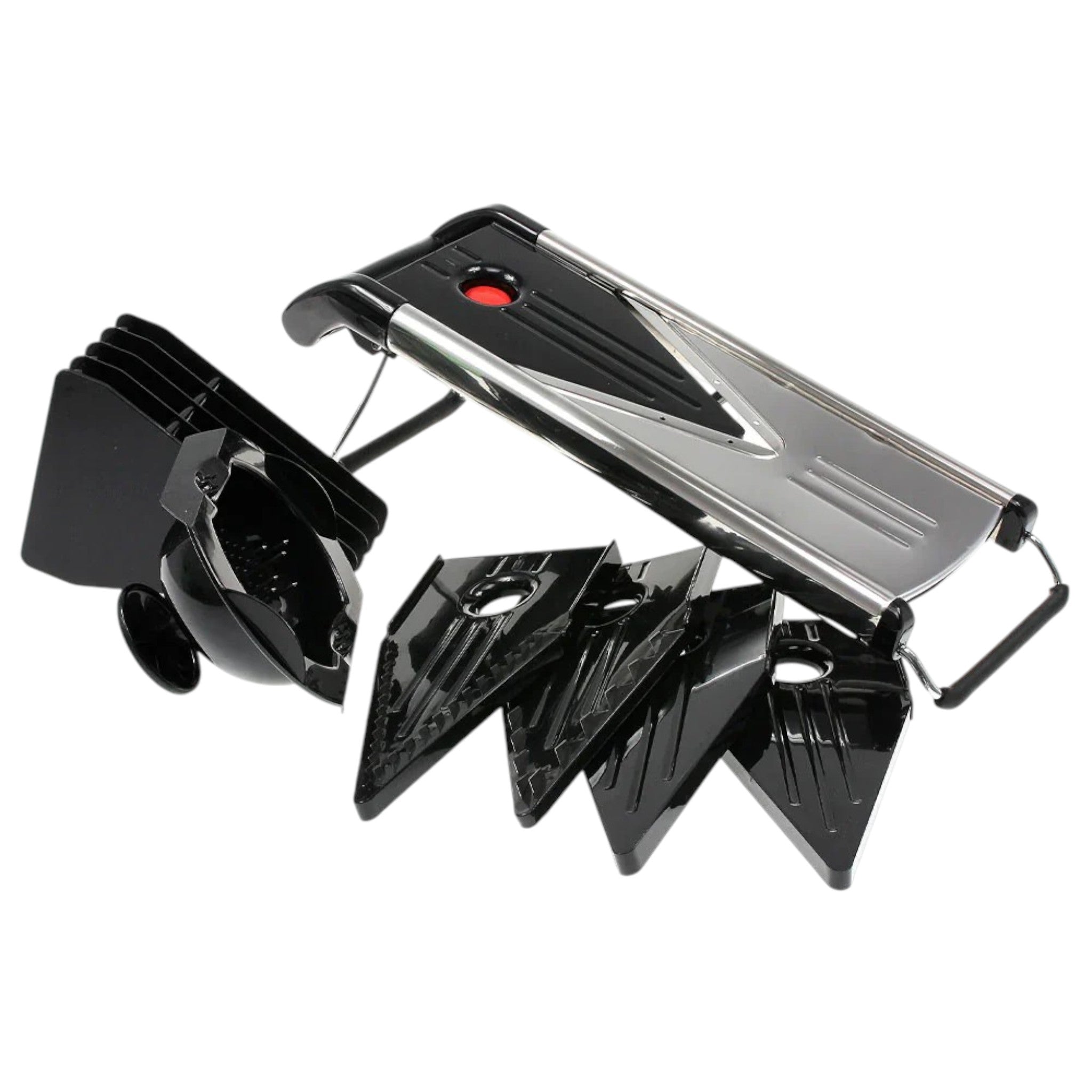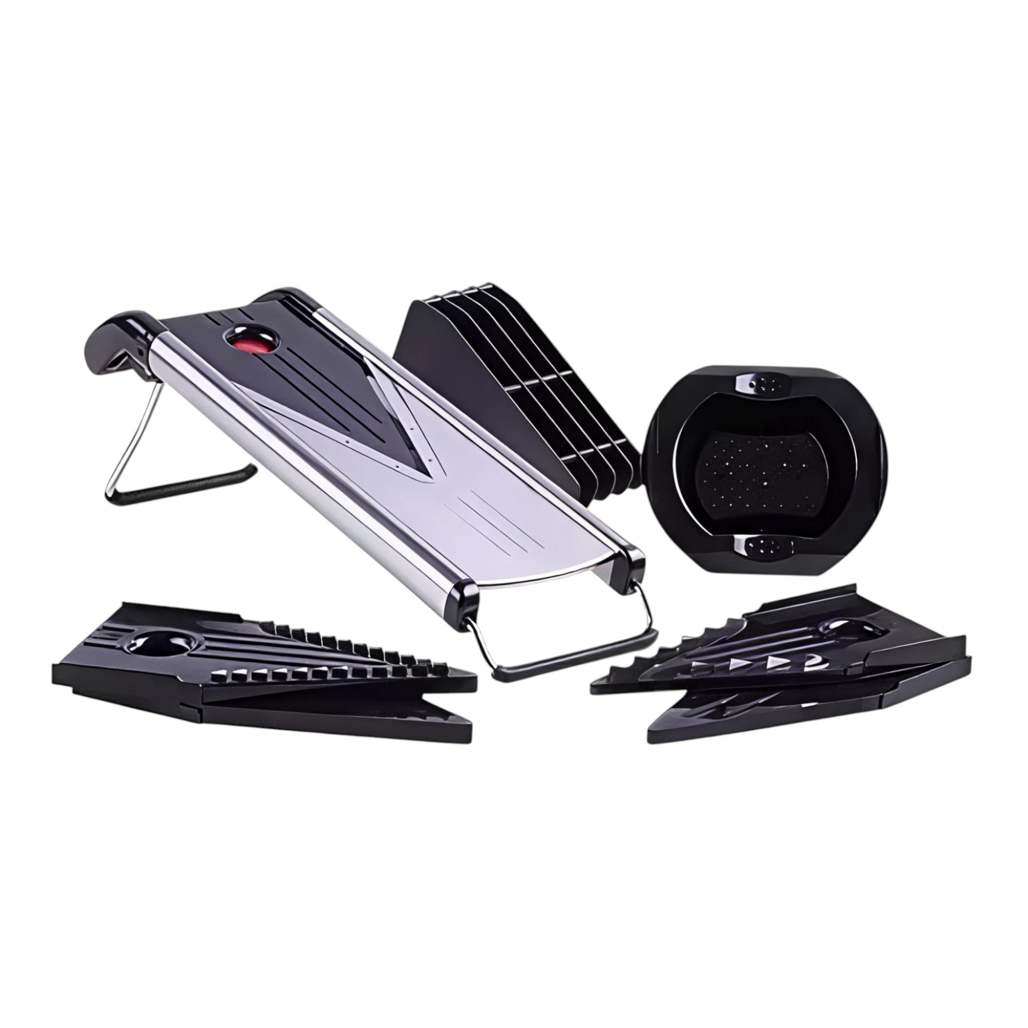 Mandolina de calidad profesional diseñada para chefs y cocinas exigentes. Permite realizar cortes precisos y uniformes en vegetales con rapidez y seguridad, ideal para un uso intensivo en restaurantes o servicios de banquetes.