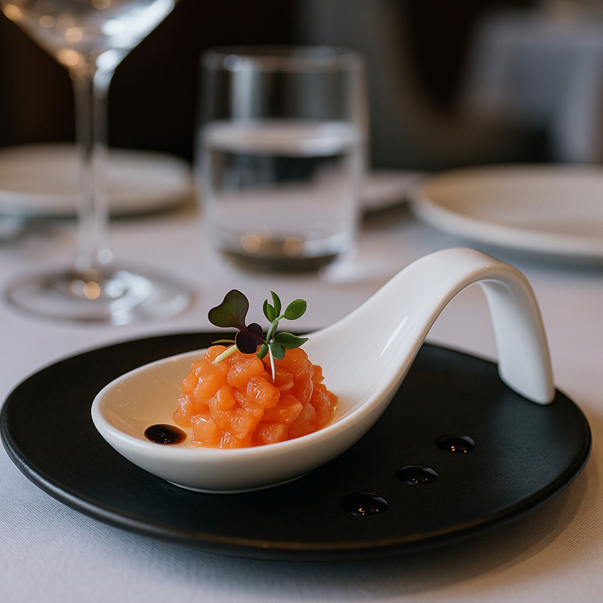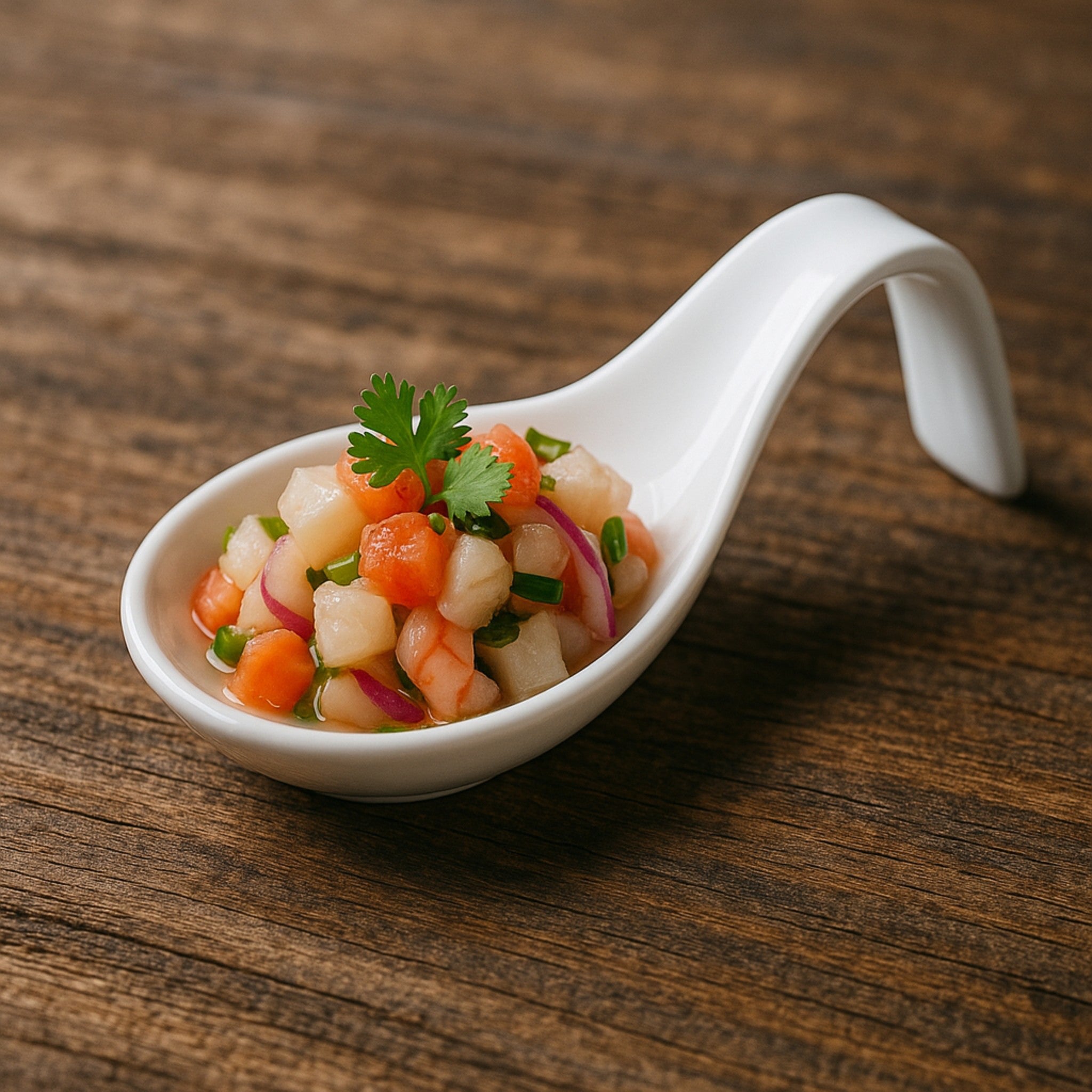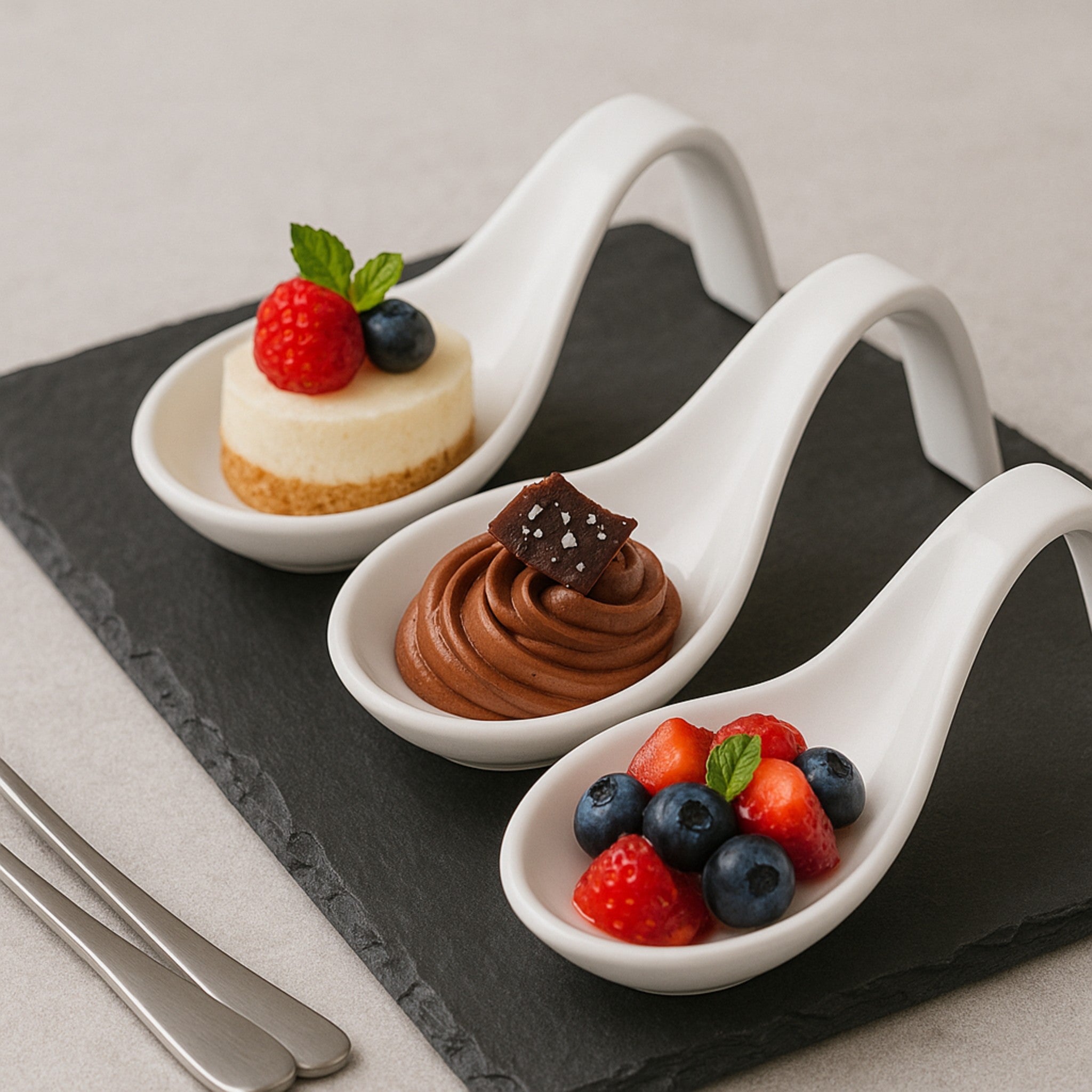 Pequeña, práctica y elegante, ideal para presentar muestras, postres o bocadillos gourmet. Fabricada con materiales resistentes y un acabado brillante que realza la presentación de cada platillo. Perfecta para caterings, eventos y degustaciones profesionales.