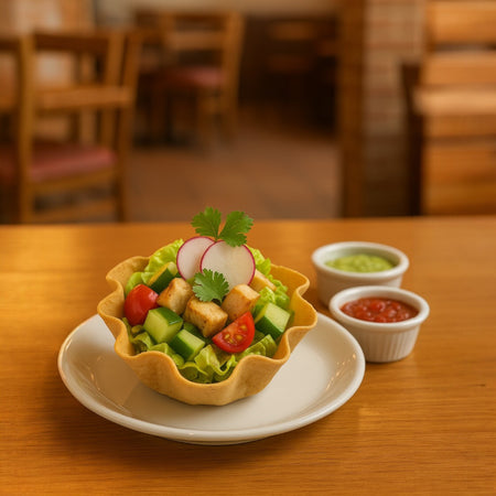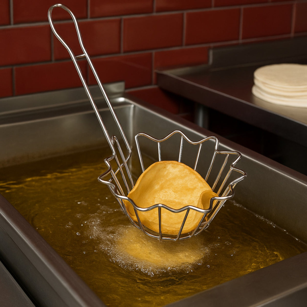 Prepara canastas de tortilla doradas y crujientes con precisión usando el molde para freír de 8 x 5 pulgadas, ideal para presentar entradas, ensaladas o platillos gourmet con un toque artesanal.