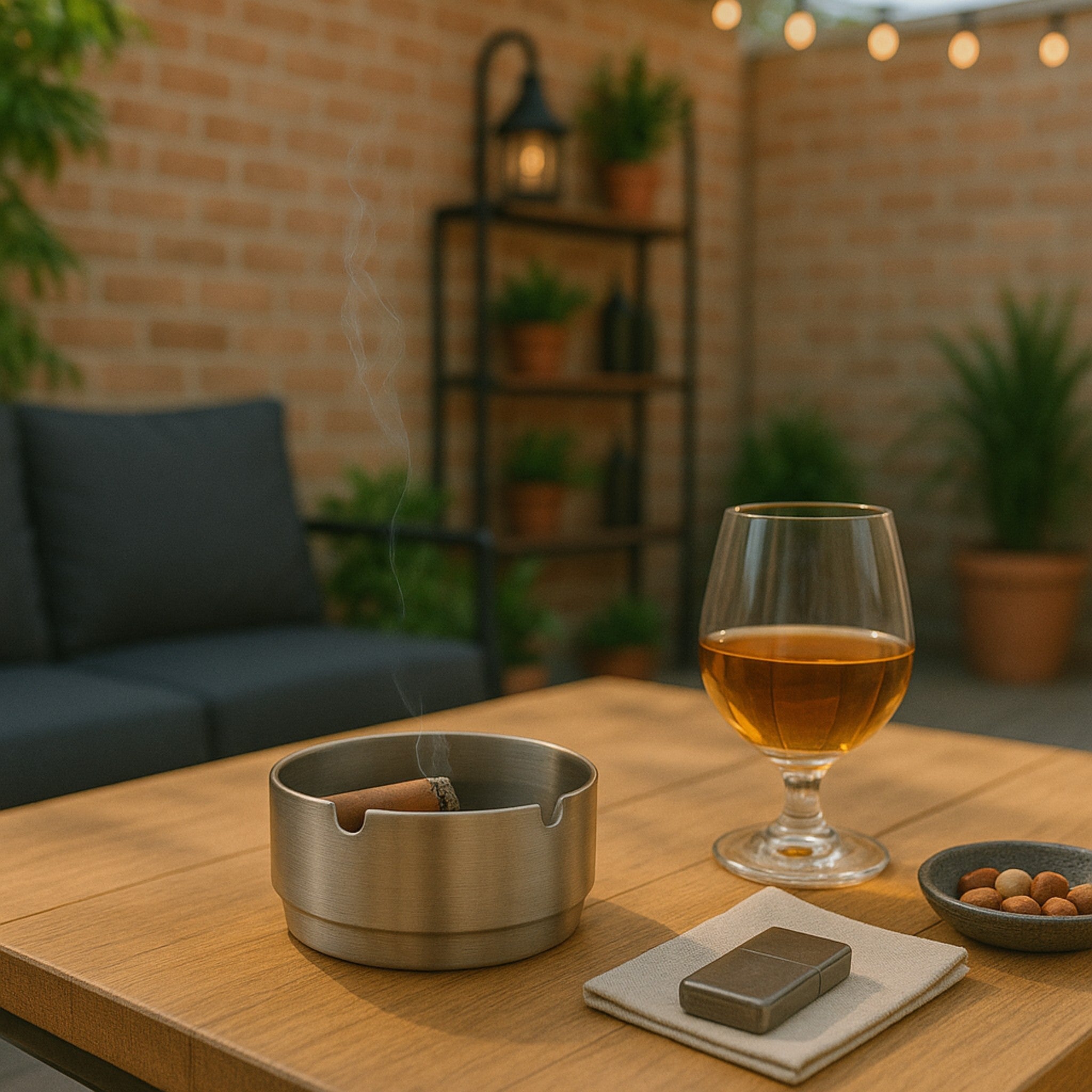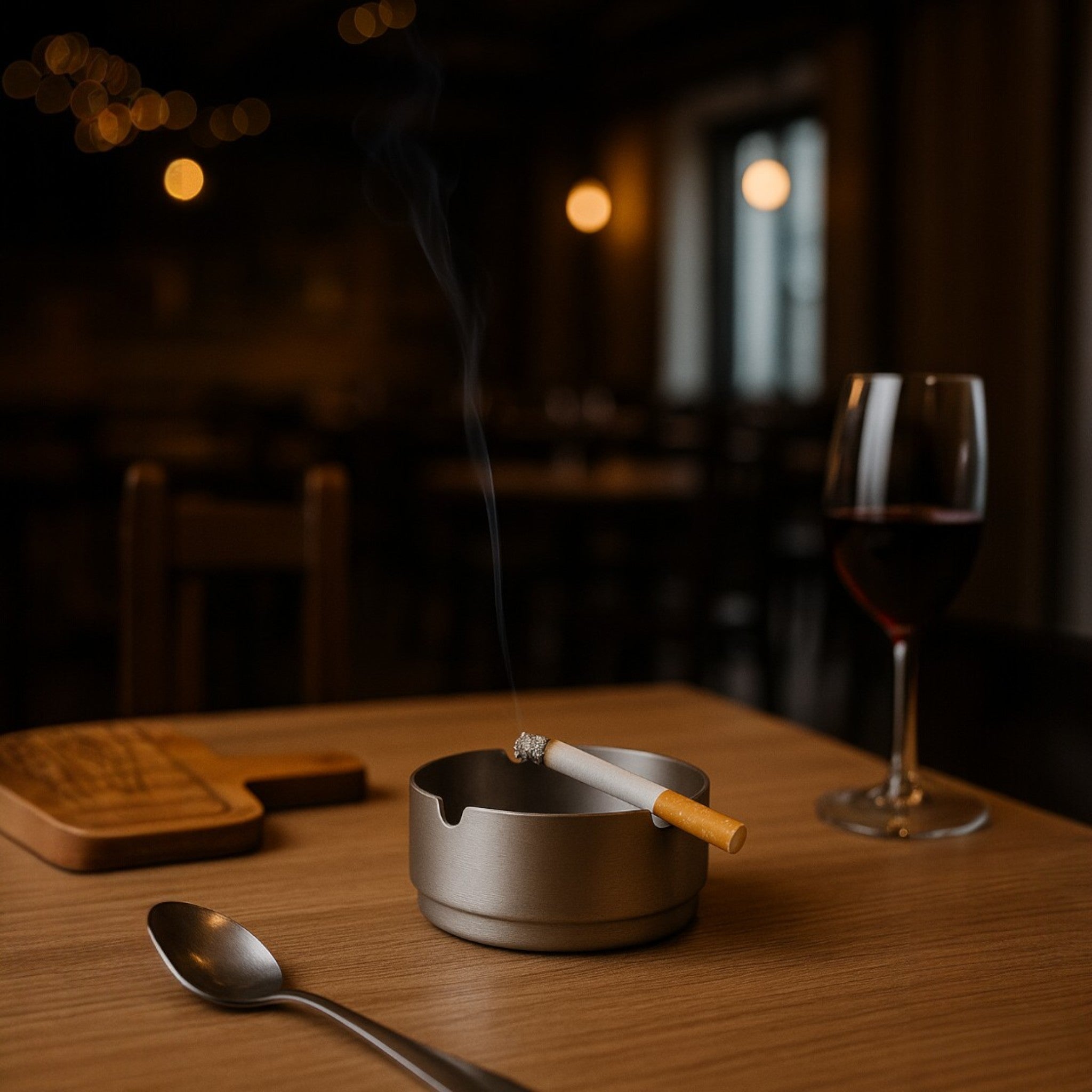 Cenicero circular de acero inoxidable de uso profesional, ideal para mesas de restaurante, áreas comunes o exteriores techados. Su diseño elegante y discreto facilita la recolección de cenizas sin comprometer la estética del espacio.
