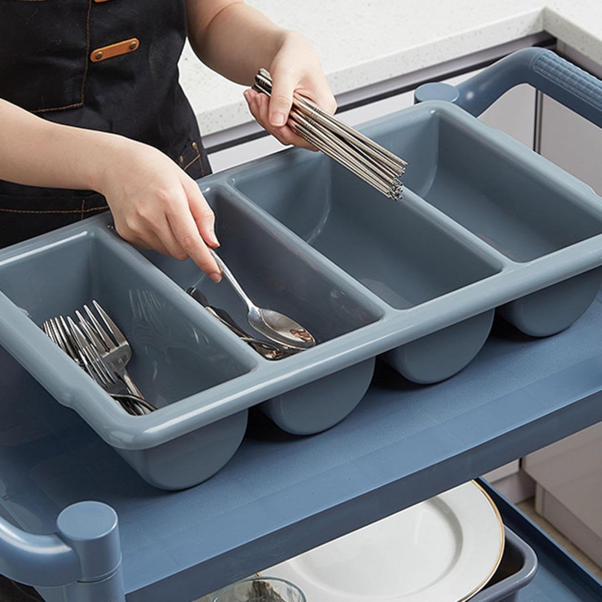Organiza tus cubiertos de forma eficiente y elegante con nuestro porta cubiertos de cuatro divisiones en gris. Ahorra espacio en tu cocina y encuentra fácilmente tus cubiertos gracias a sus divisiones. ¡Mantén tu cocina ordenada y estilosa con este práctico accesorio!