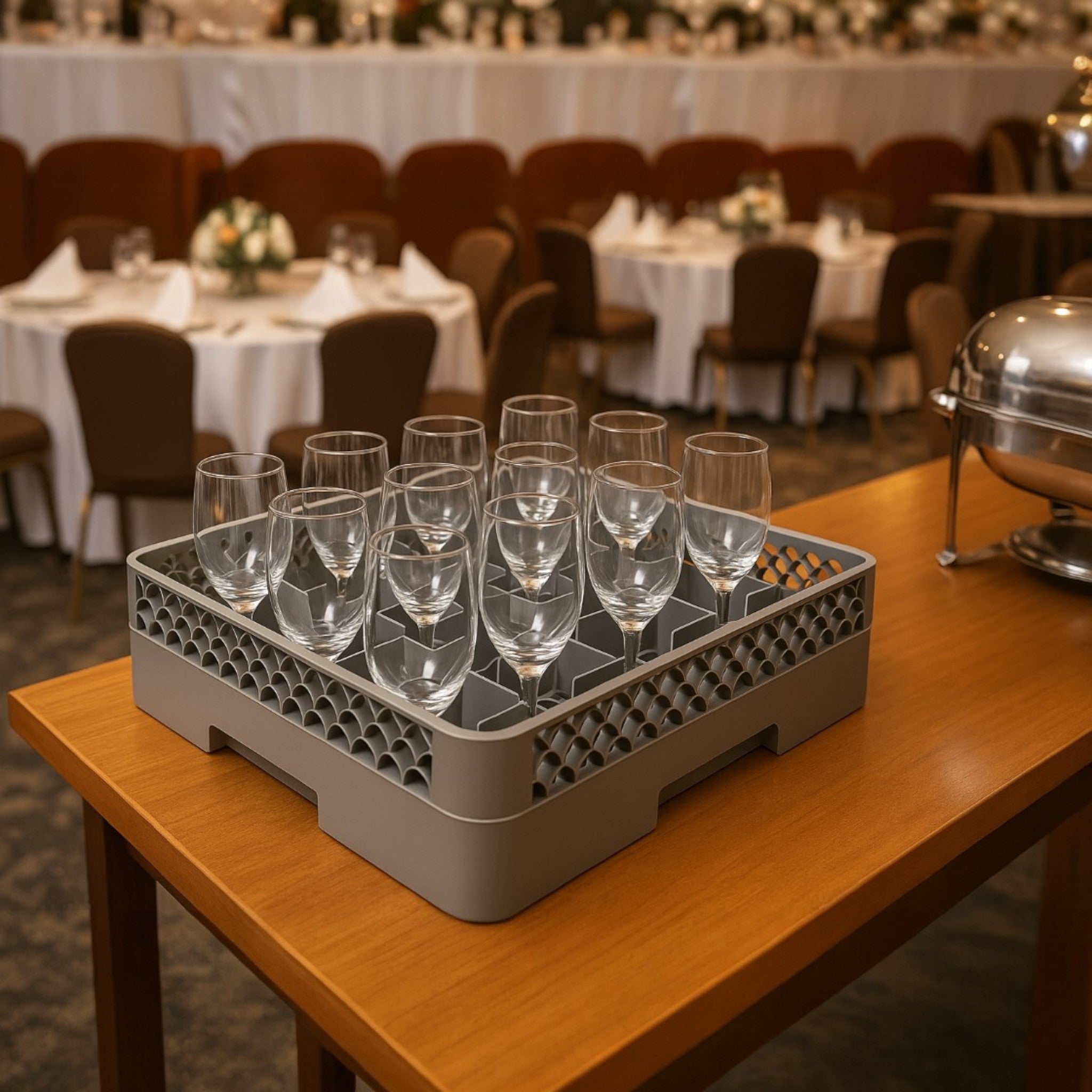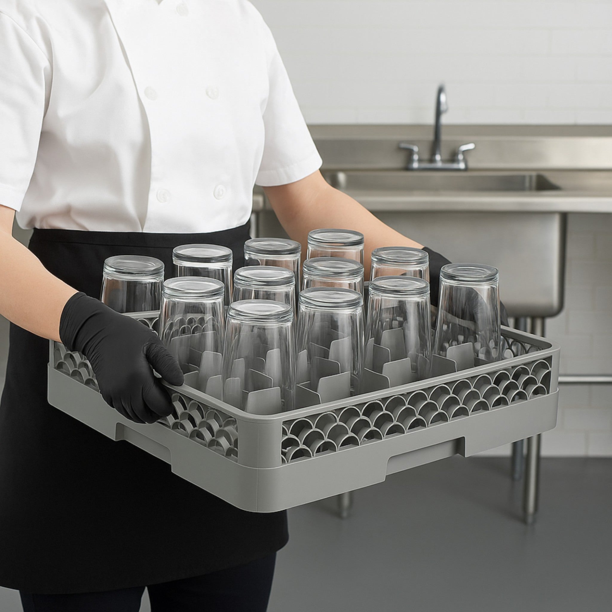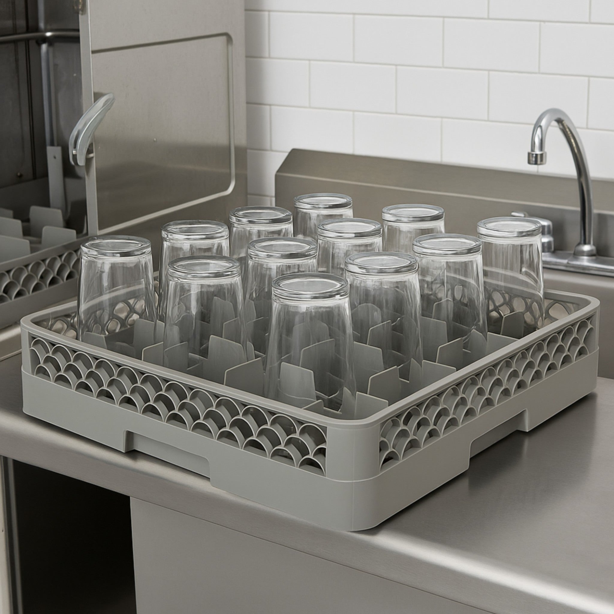 Optimiza el lavado, secado y almacenamiento de vasos con este práctico rack de 16 compartimentos. Diseñado para ofrecer máxima protección, evita golpes y rayaduras durante el manejo. Ideal para cocinas profesionales, bares y banquetes.
