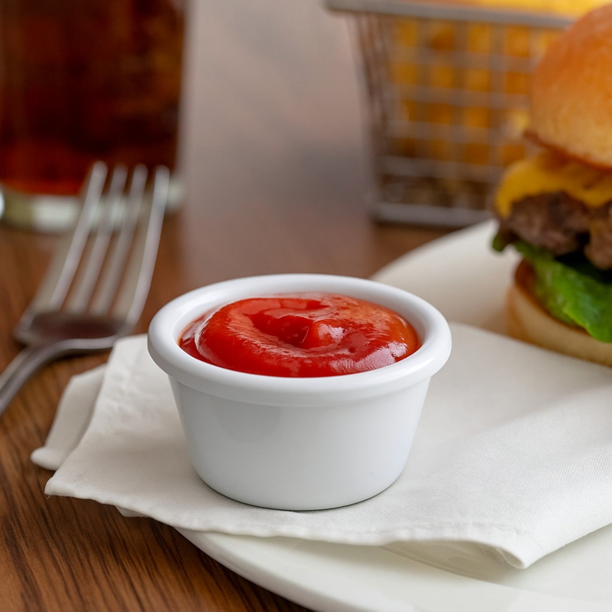Este ramekin de melamina blanco de 3 oz combina funcionalidad y estilo en un diseño compacto y resistente. Ideal para porciones individuales de salsas, dips o ingredientes, es una excelente adición para cocinas profesionales y hogares.