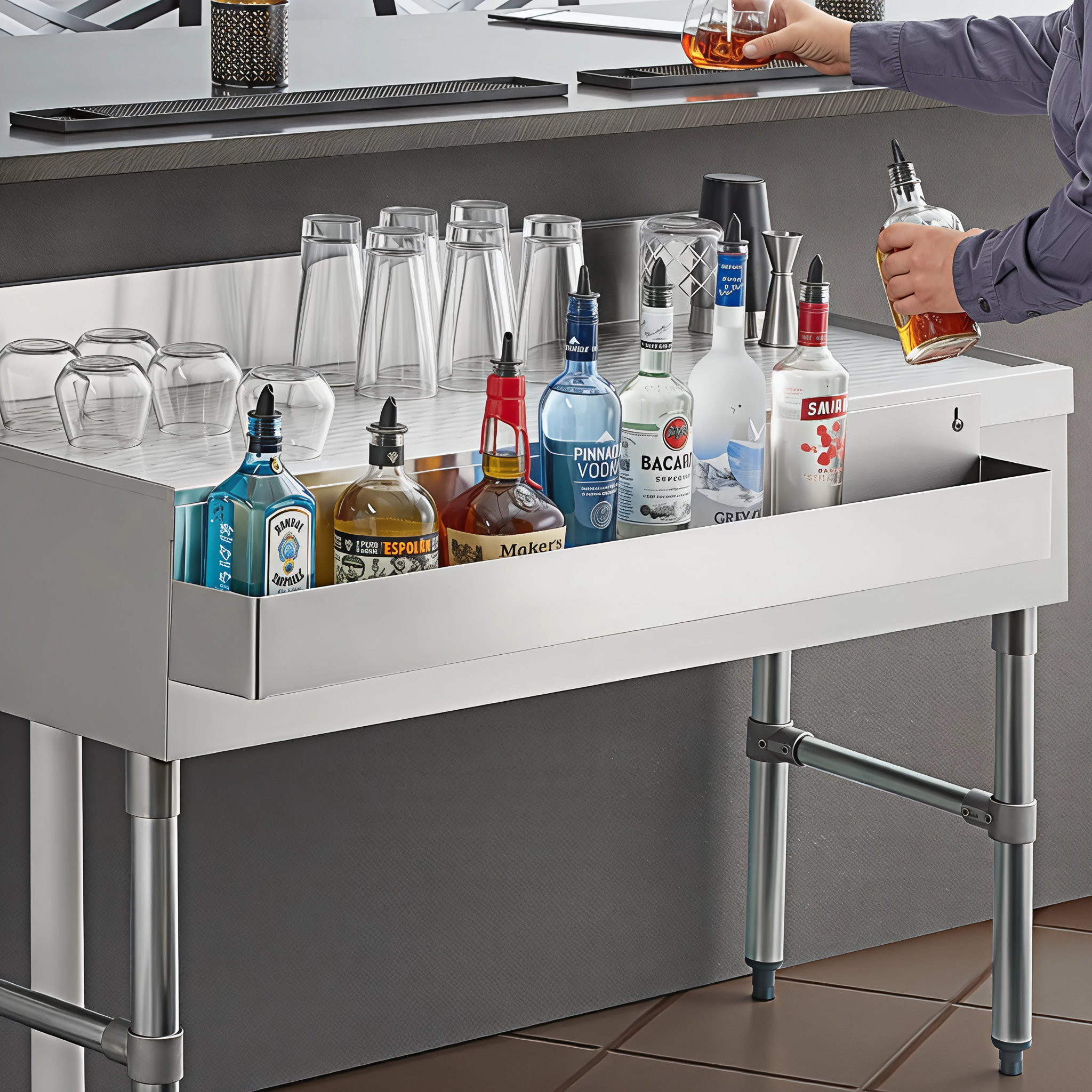 Organiza tu barra con estilo y eficiencia usando el riel para botellas en acero inoxidable, ideal para bares, cocinas profesionales y estaciones de servicio.