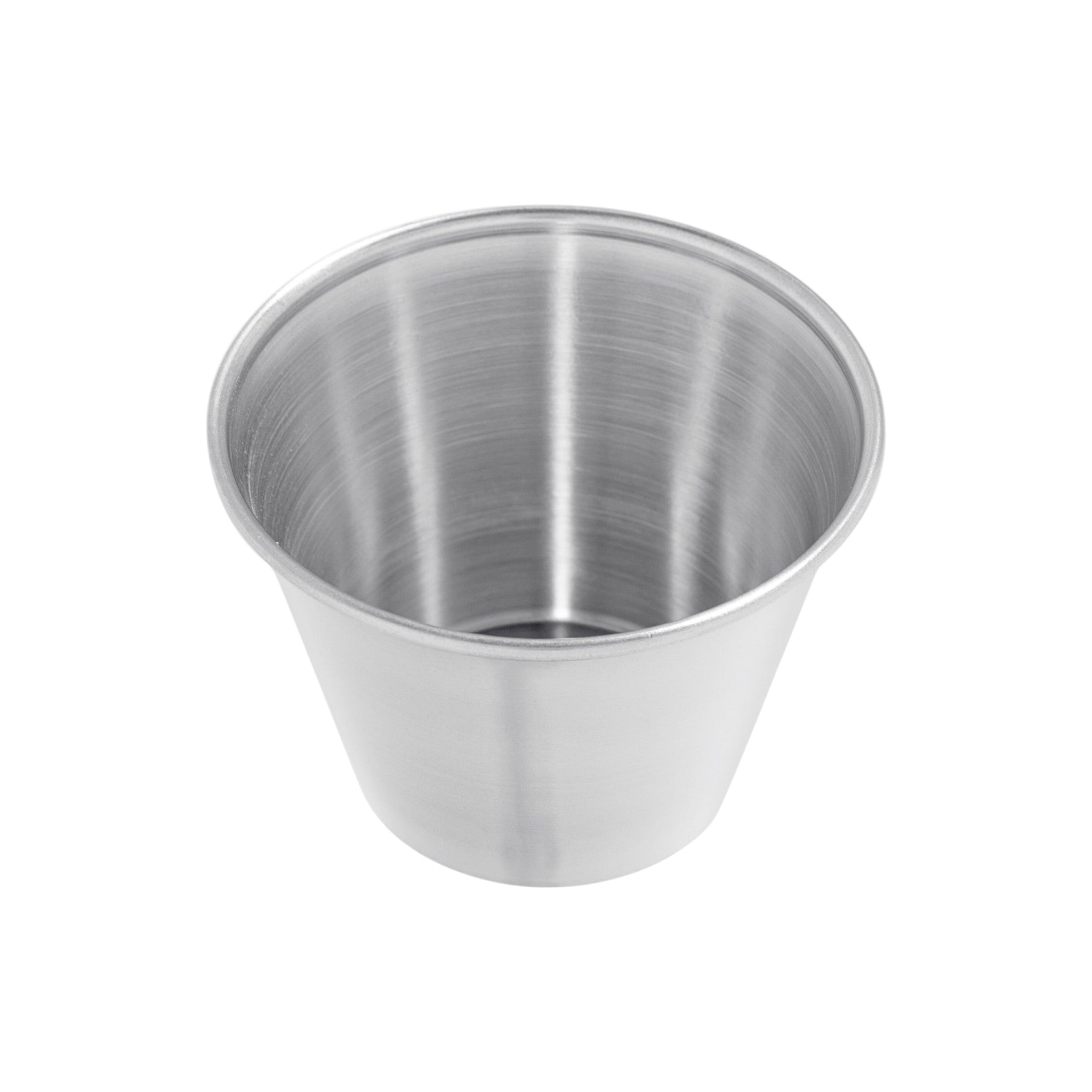 Salsera de acero inoxidable con diseño tipo ramequín, ideal para servir salsas, dips, aderezos y guarniciones en mesa o barra de servicio. Su acabado resistente asegura una larga vida útil en cocinas profesionales.