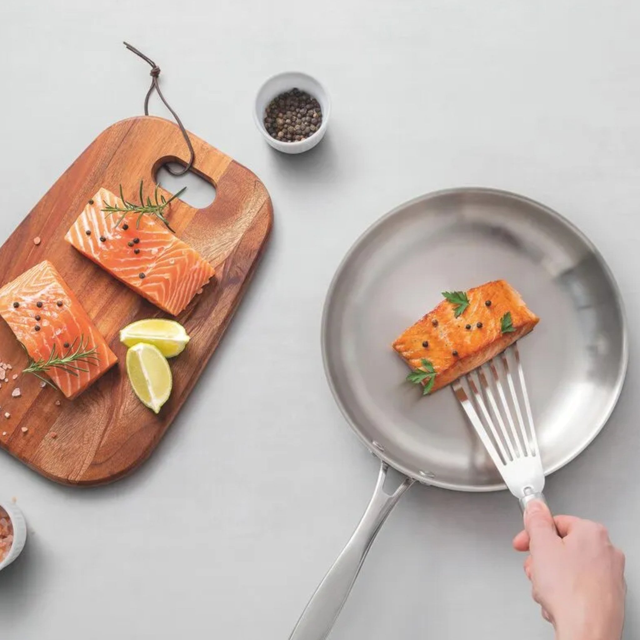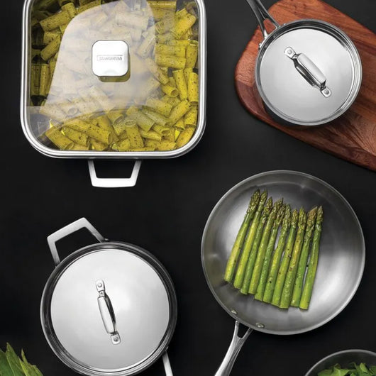 • Tecnología Tri-Ply: Consta de tres capas: acero inoxidable en el interior y exterior, y una capa de aluminio en el núcleo. Este diseño permite una distribución uniforme del calor, reduciendo puntos fríos y asegurando resultados consistentes en la cocción.