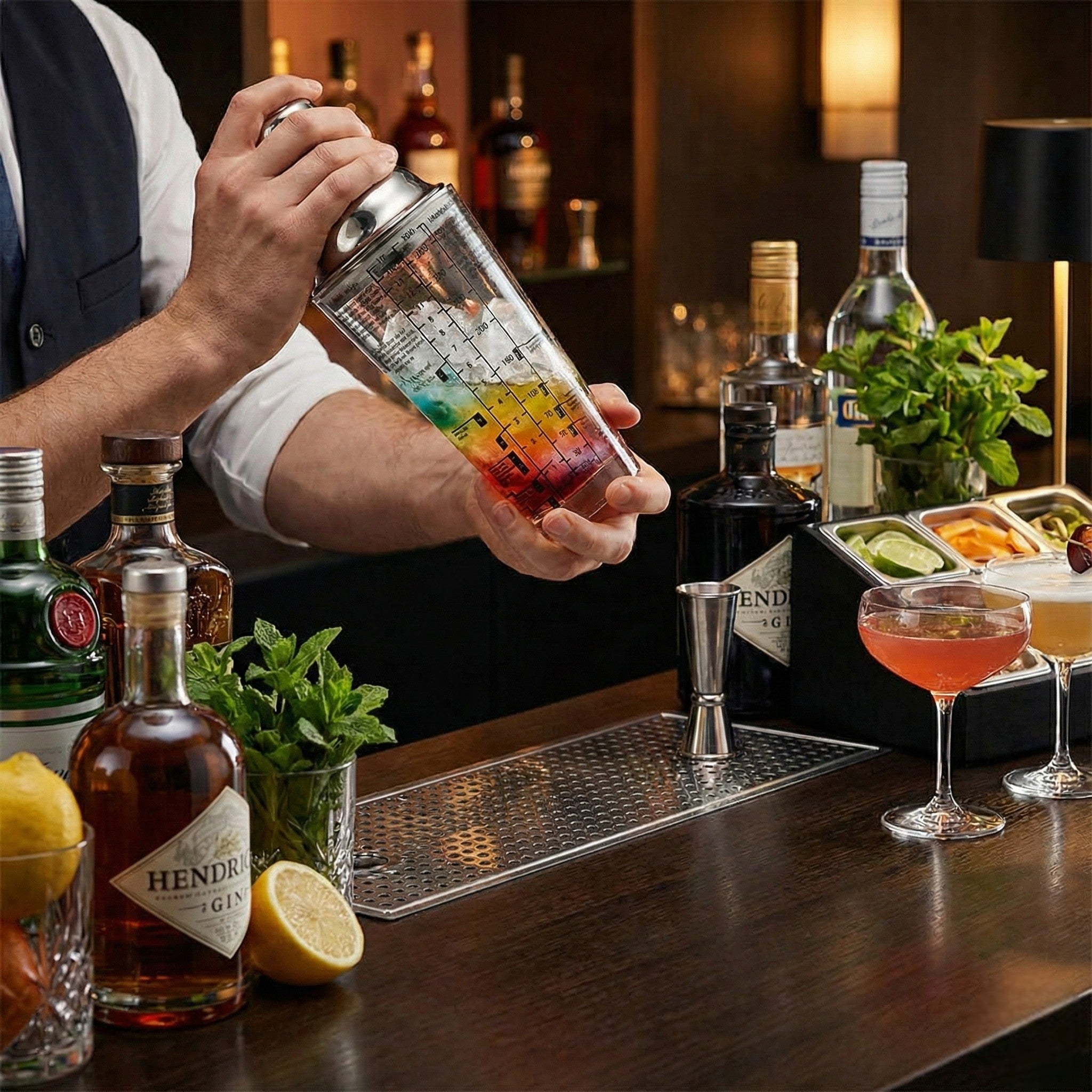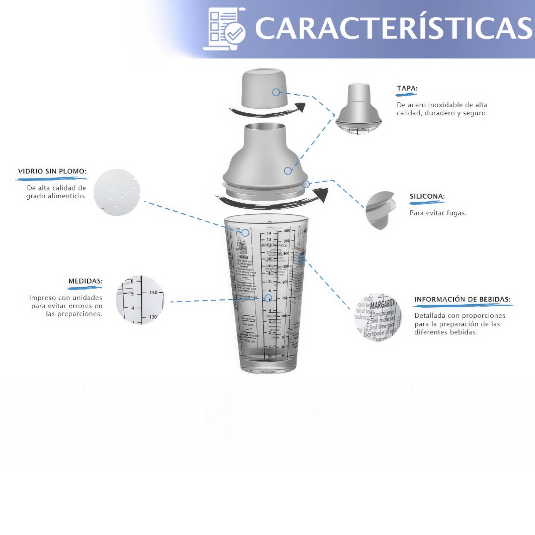 El shaker con vaso de vidrio ofrece una mezcla precisa y limpia, combinando funcionalidad y presentación profesional. Su construcción robusta permite trabajar cómodamente en barra u operación diaria, manteniendo estabilidad y buen control.