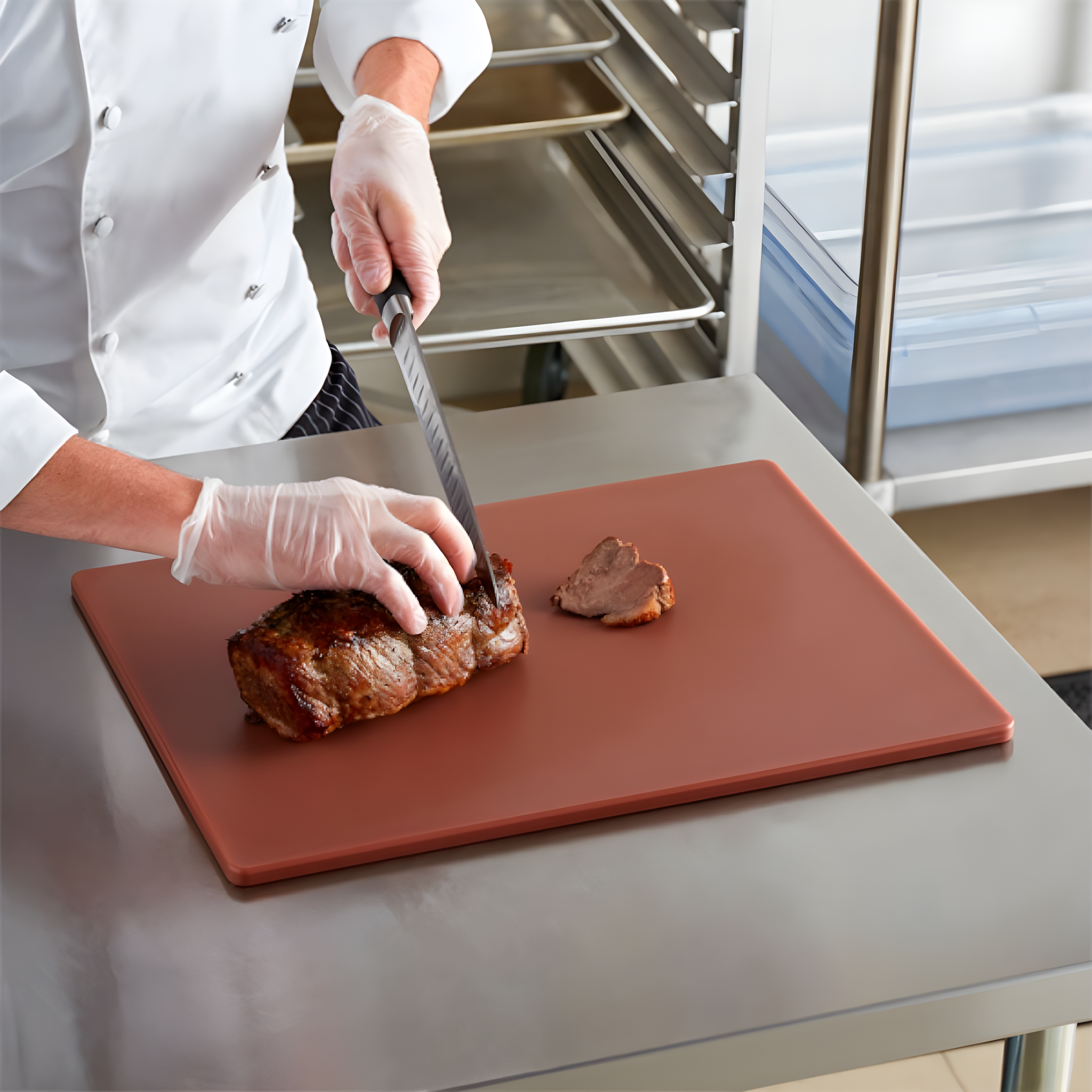 ¡¡Optimiza tu espacio de trabajo con nuestra versátil tabla para cortar PP en tres convenientes tamaños, todos en un elegante tono café, perfectos para cortar carnes cocidas!