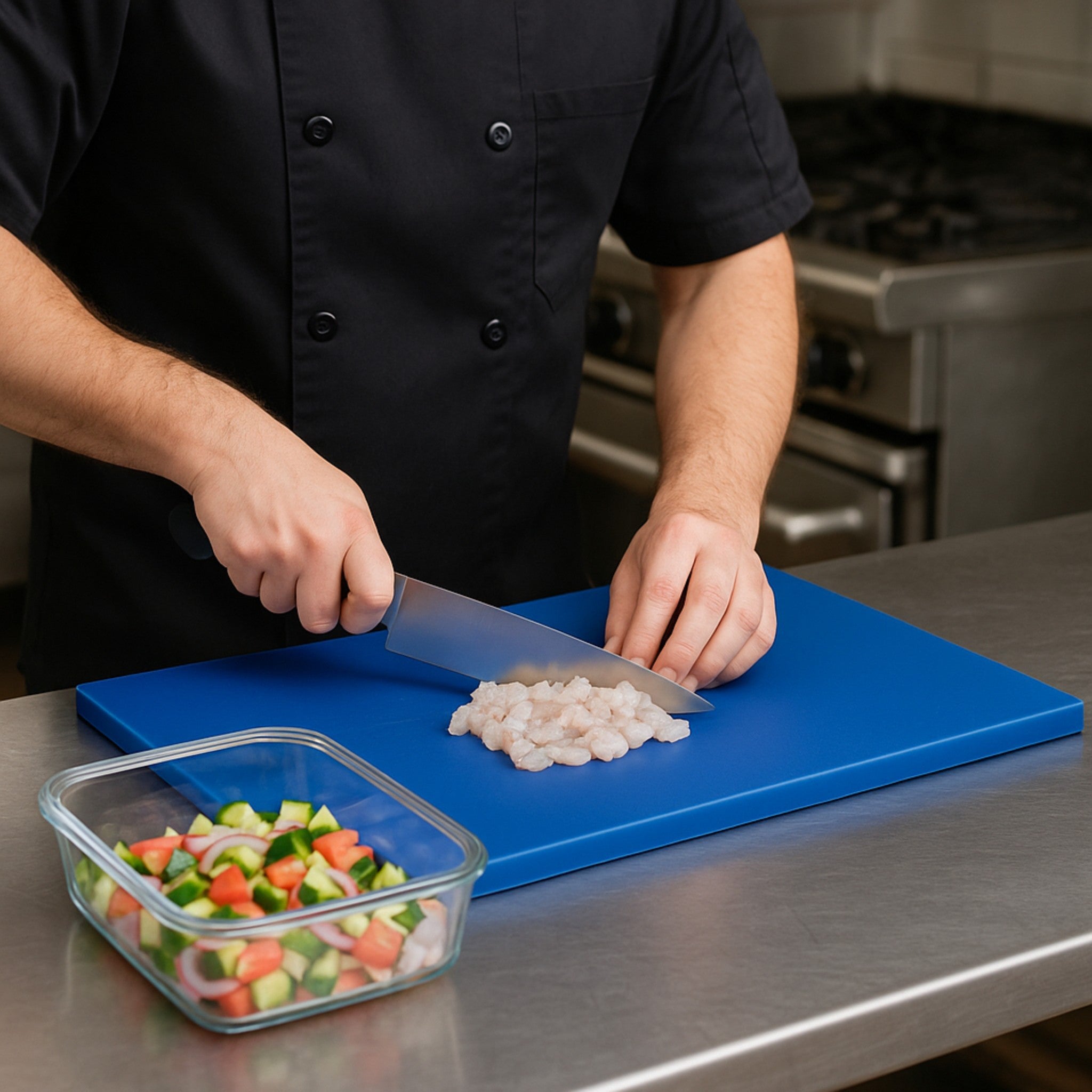 Tabla para picar azul de 45×30×1.8 cm fabricada en polietileno de alta densidad, ideal para separar alimentos y evitar la contaminación cruzada.