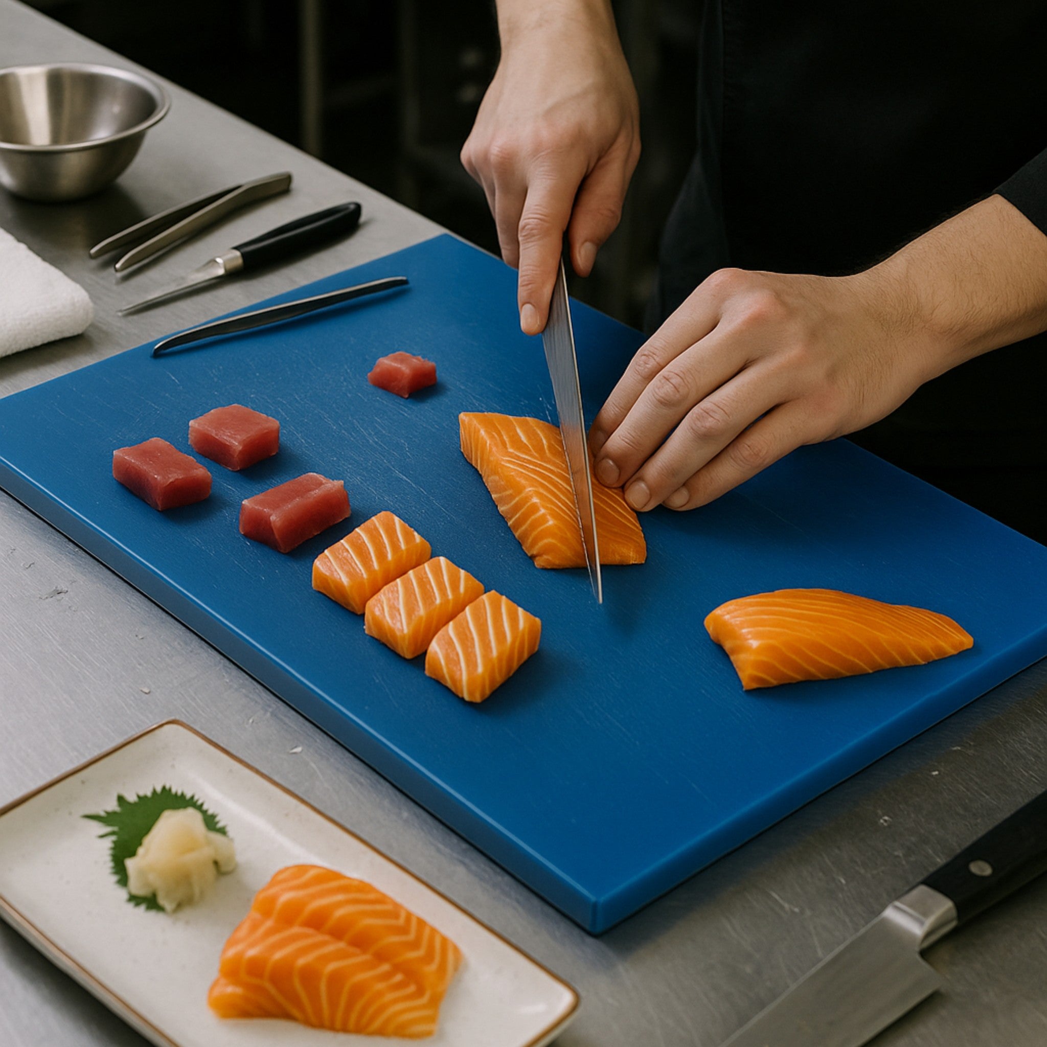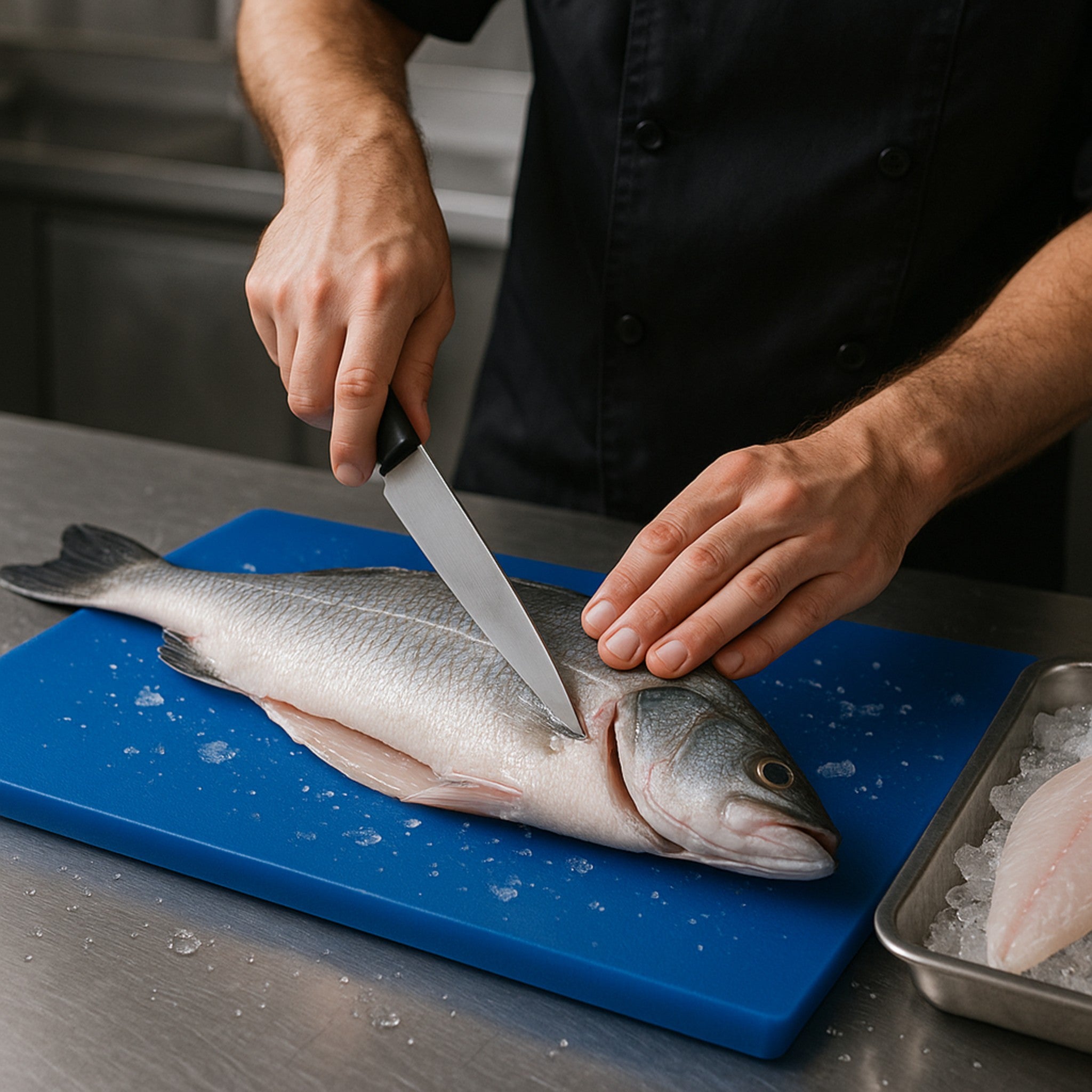 Color azul funcional: Facilita la identificación del área de corte destinada a pescados y mariscos crudos.