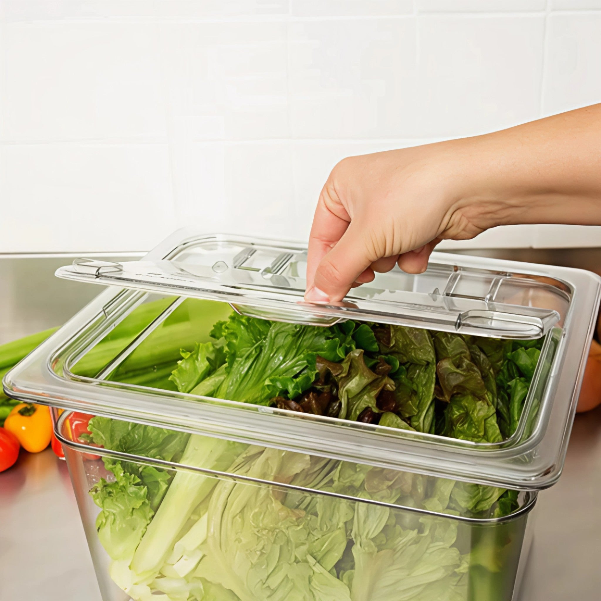 Encaje seguro: Compatible con insertos Camwear GN 1/2, se ajusta firmemente para proteger los alimentos y evitar contaminaciones cruzadas.