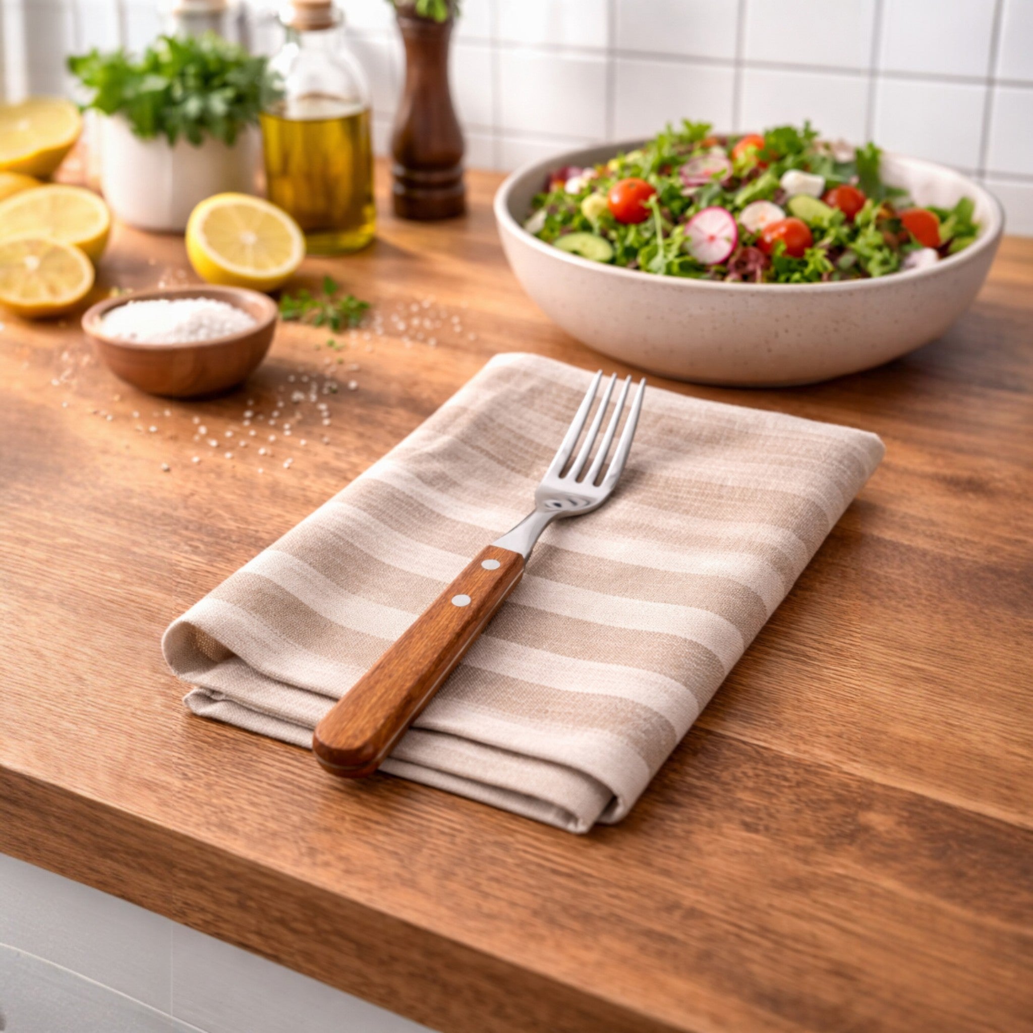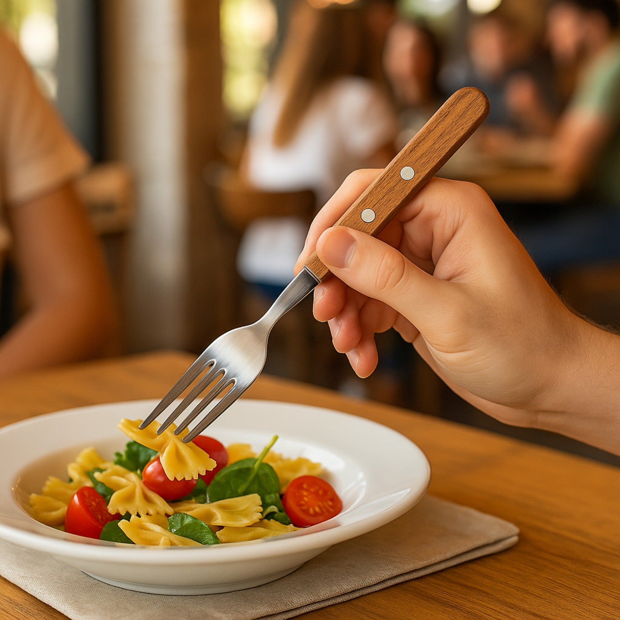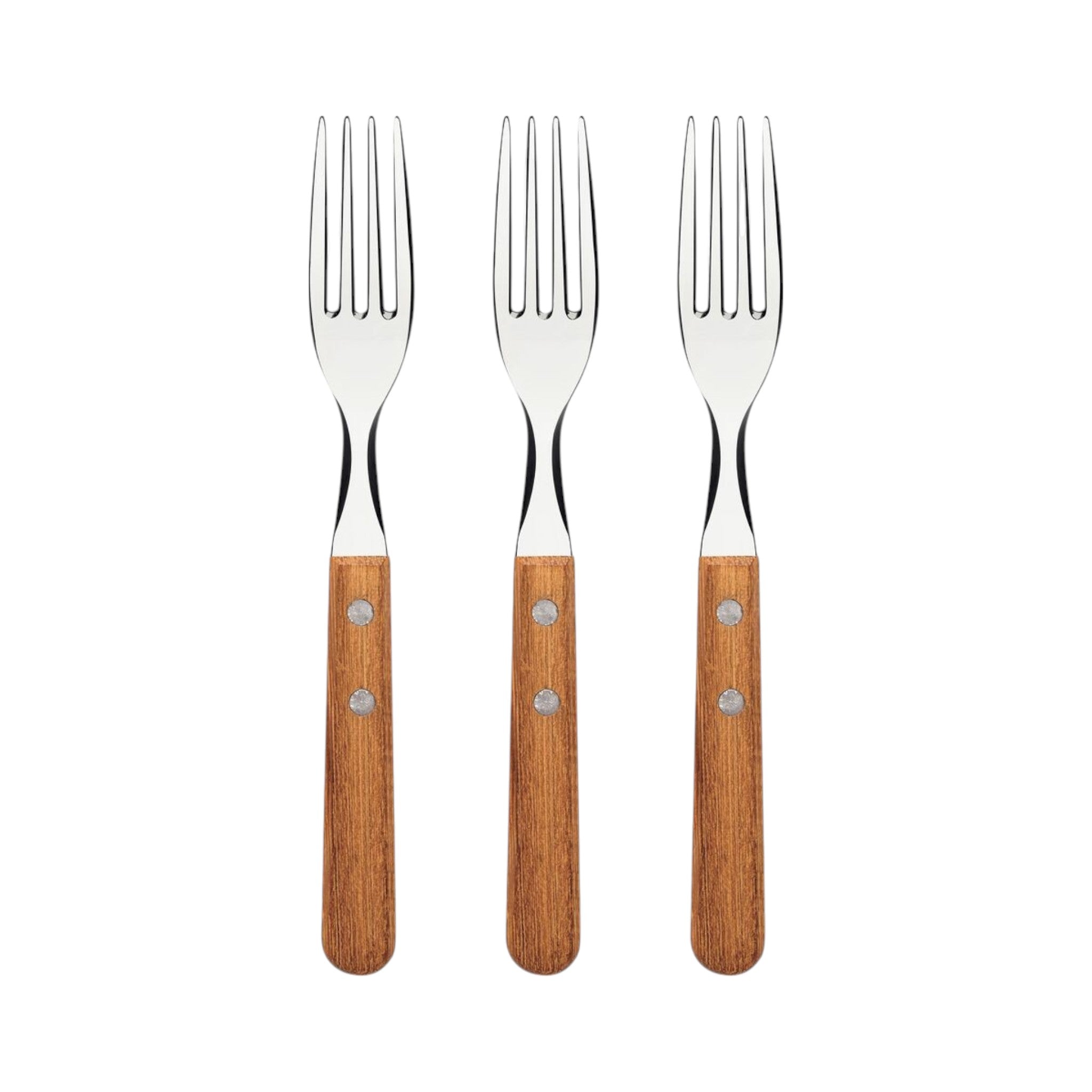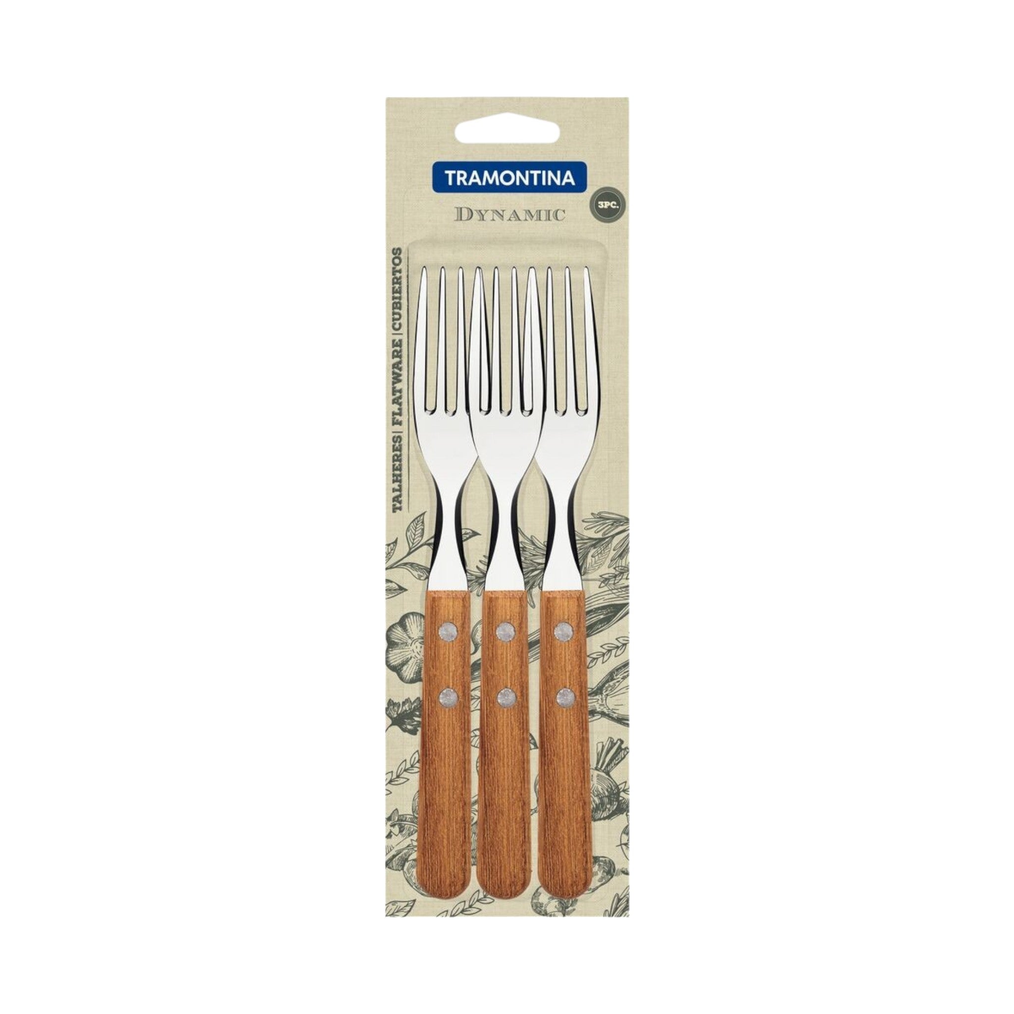Juego de 3 tenedores Tramontina Dynamic con mango de madera natural y cuerpo de acero inoxidable. Su diseño resistente y funcional es ideal para el uso diario en restaurantes o mesas profesionales. Una opción práctica con el toque cálido de la madera.
