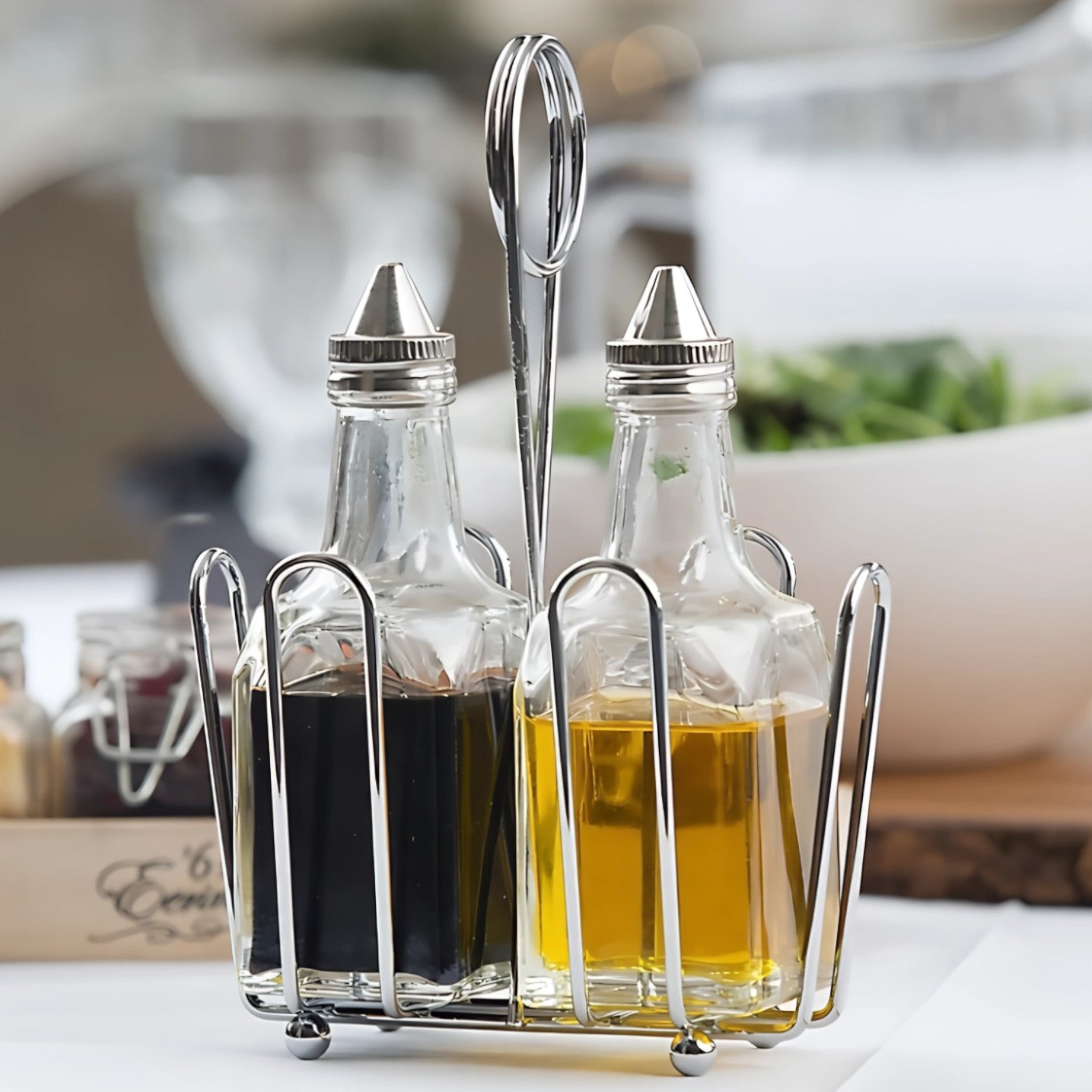 Una vinagrera elegante y funcional, ideal para mesas modernas y cocinas prácticas. Su diseño de vidrio transparente permite ver el contenido con claridad. Perfecta para servir aceite o vinagre con estilo y precisión.