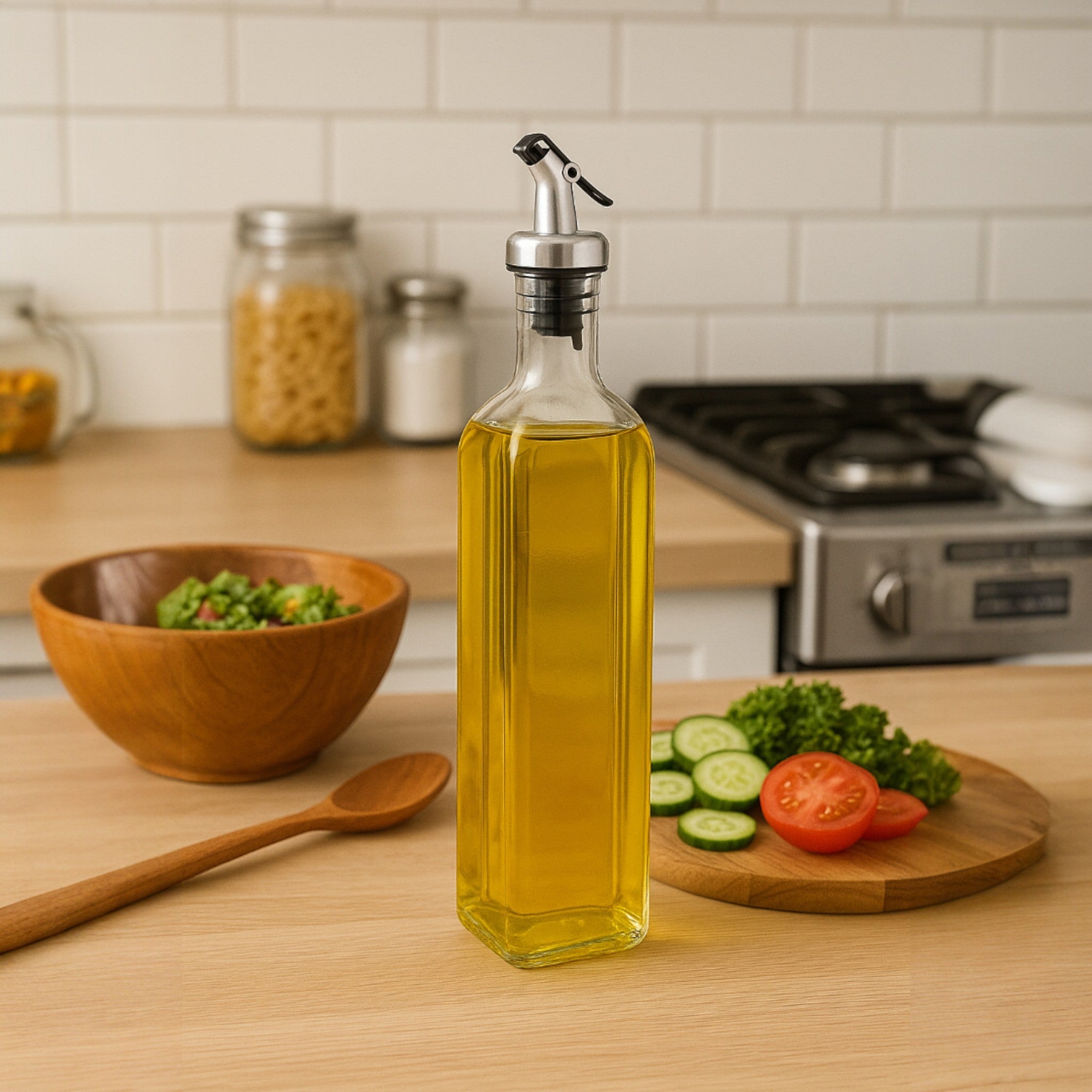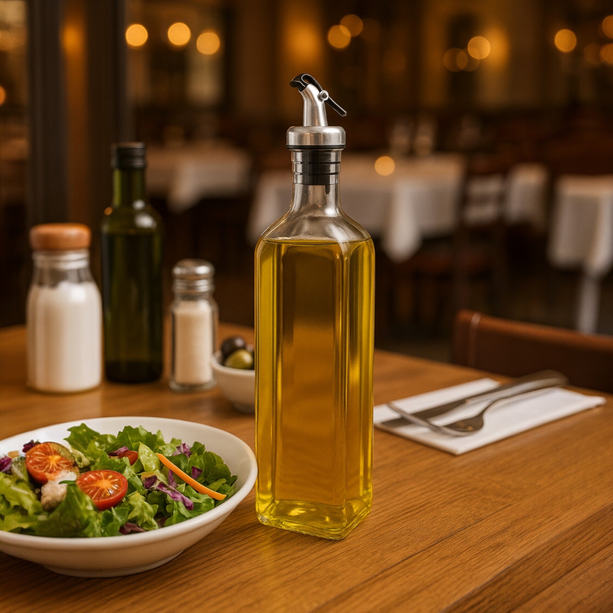 Vinagrera cuadrada de 500 ml fabricada en vidrio transparente, ideal para servir aceite, vinagre o aderezos líquidos en mesas de restaurante, barra o cocina. Su diseño liso y forma estable ofrecen una presentación limpia y profesional.