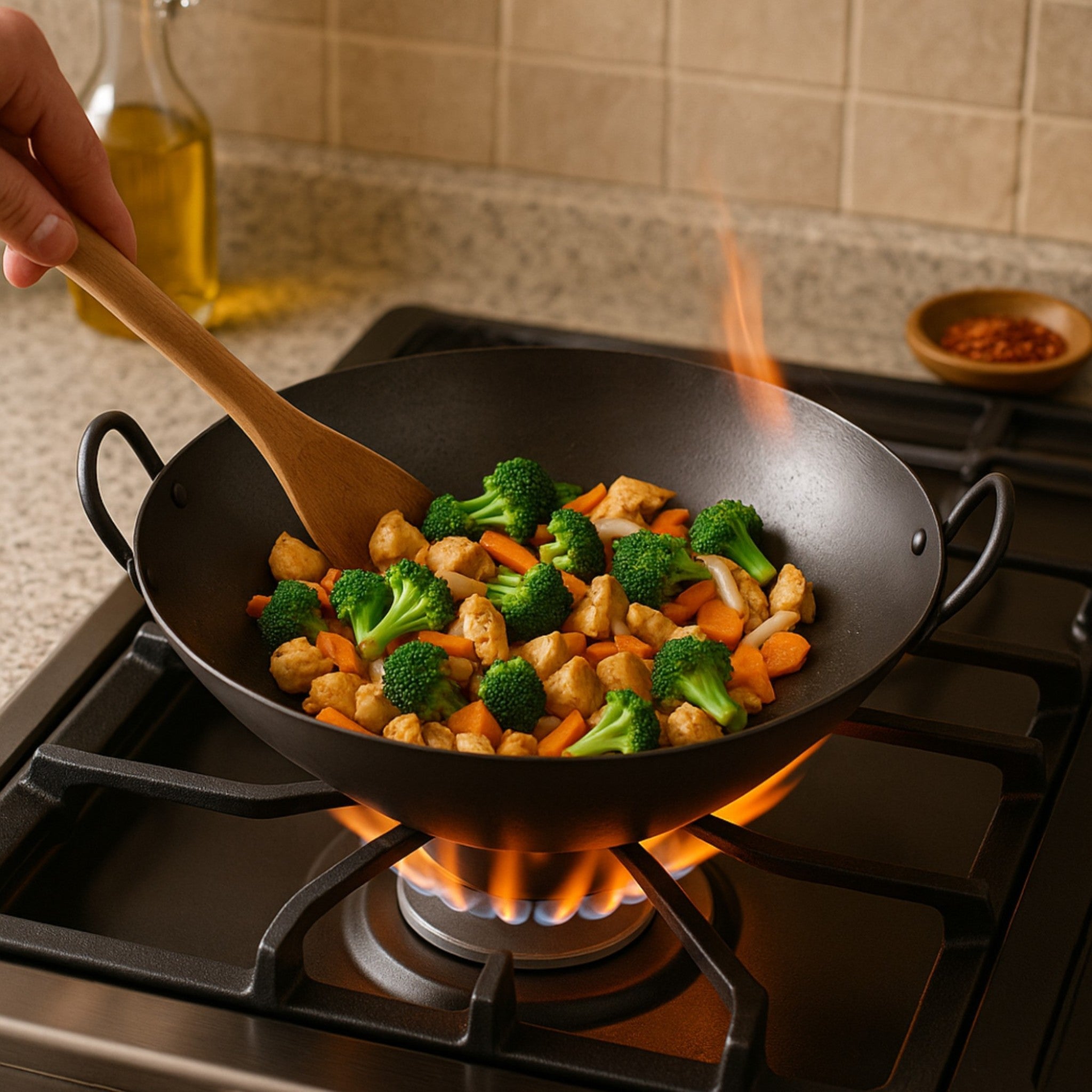 Acero al carbón de alta conducción: Calienta rápidamente y distribuye el calor de forma pareja para un salteado perfecto.